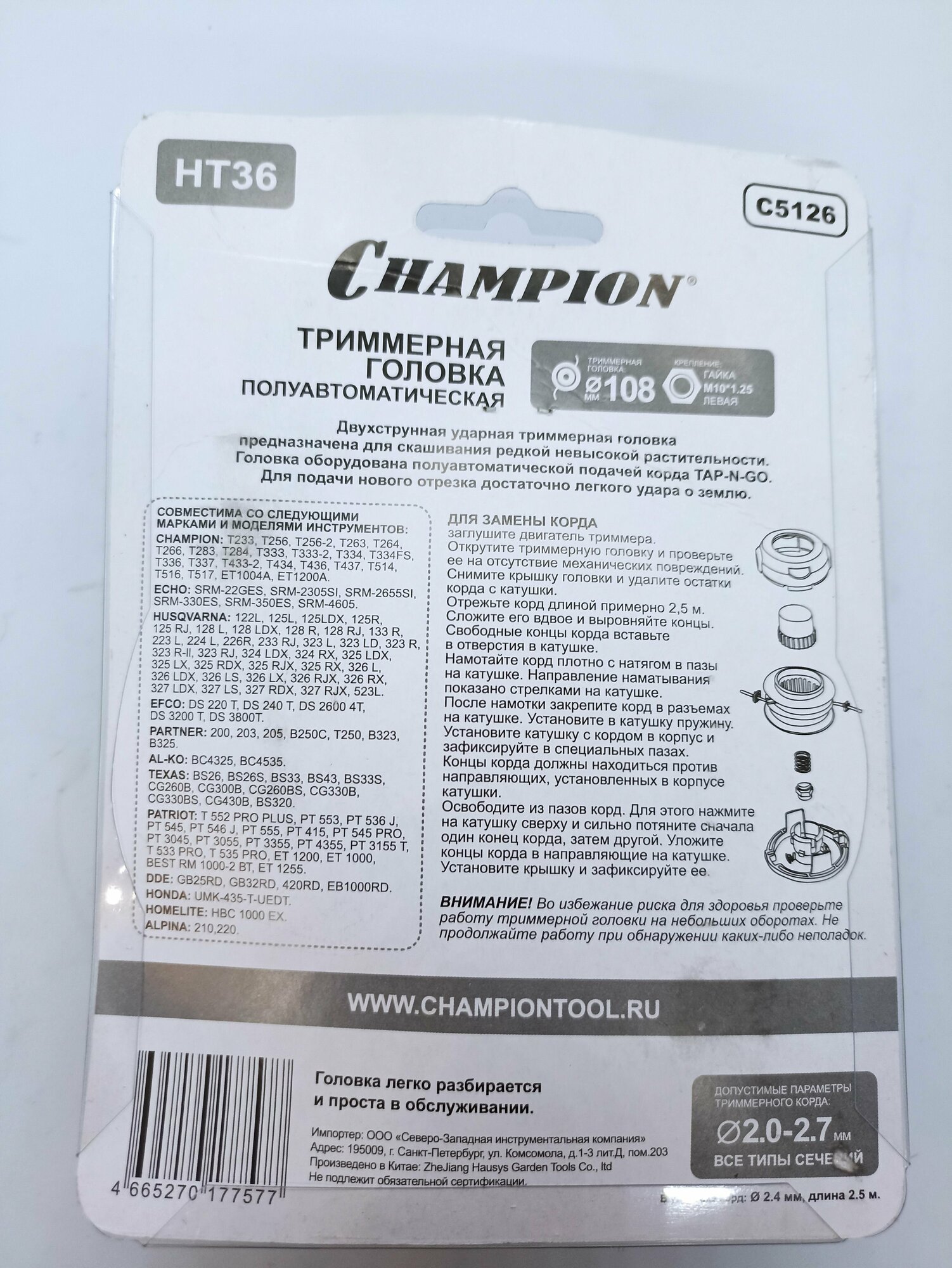| Дополнительная информация | Головка триммерная CHAMPION HT36 компактная - 1 шт |