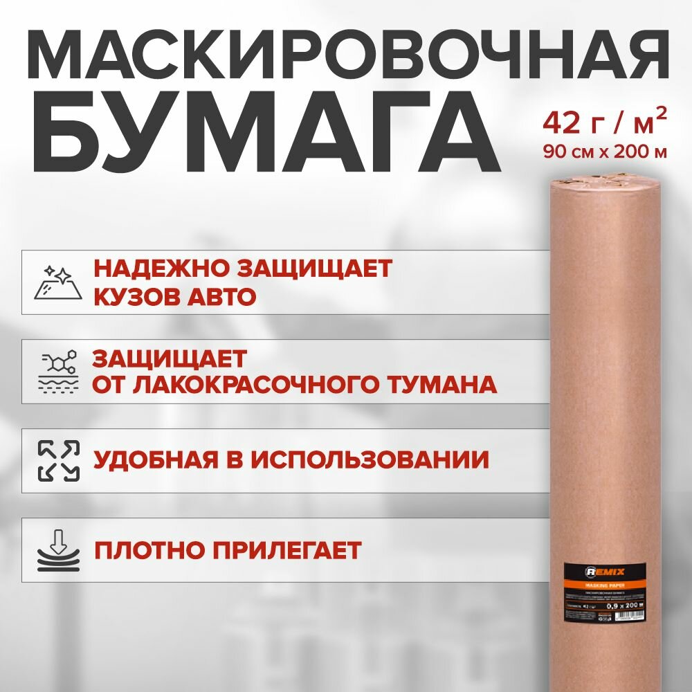 Защитная малярная бумага REMIX в рулоне 90 см х 200 м / укрывная маскировочная бумага для покраски автомобиля / крафт-бумага упаковочная