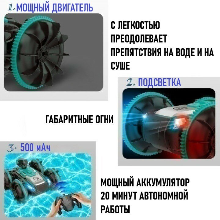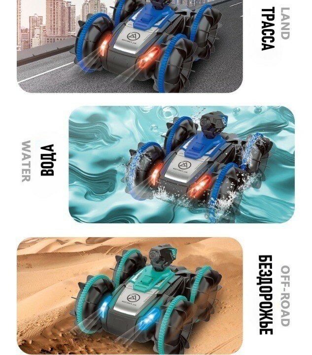 | Комплектация | Машина Амфибия - 1шт., Литиевый аккумулятор - 1шт, отвертка, пульт ДУ - 1шт., брелок для управления жестами на руку - 1шт, шнур для зарядки - 1шт, |