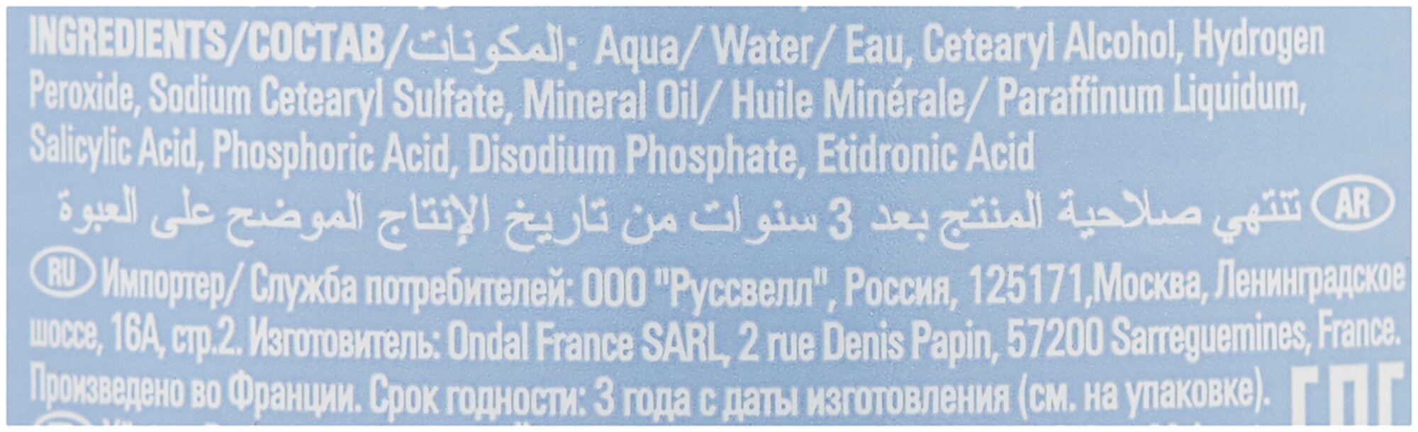 | Состав | aqua, cetearyl alcohol, hydrogen peroxide, sodium cetearyl sulfate, mineral oil / huile minerale / paraffinum liquidum, salicylic acid, disodium phosphate, etidronic acid |