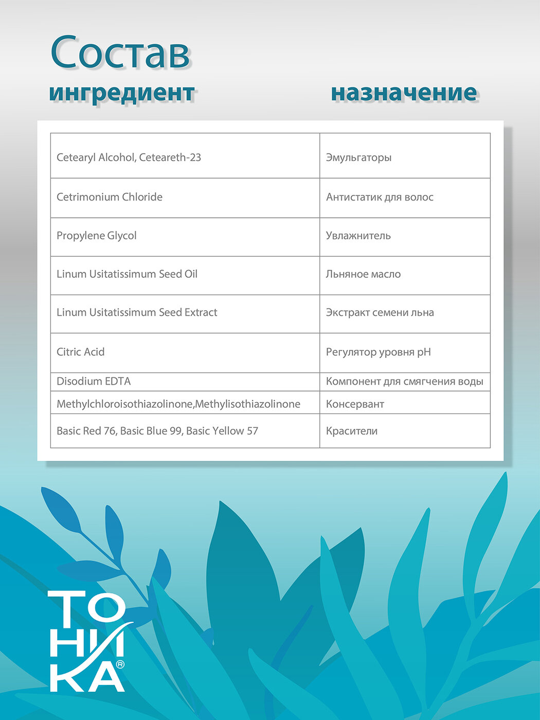 | Состав | Aqua, Cetearyl Alcohol, Propylene Glycol, Ceteareth-23, Cetrimonium Chloride, Linum Usitatissimum Seed Oil, Linum Usitatissimum Seed Extract, Disodium EDTA, Citric Acid, Methylchloroisothiazolinone, Methylisothiazolinone, Parfum, Basic Red 76, HC Blue No 15, Basic Yellow 57. |
