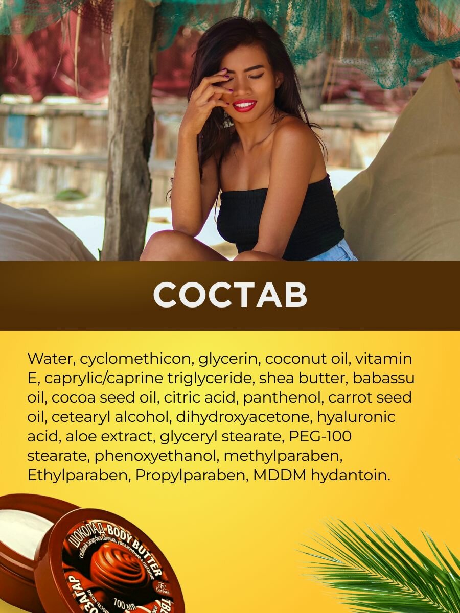 | Состав | вода питьевая, изогексадекан, масло пальмовое гидрогенизированное, спирт цетеариловый, циклометикон, дигидрооксиацетон, озокерит, глицерил стеарат, ПЭГ-100 стеарат, дидецен гидрогенизированный, диметикон 1000, масло какао, натрия акрилат/натрия акрилоилдиметил таурат сополимер, ПЭГ-7 глицерил кокоат, ПЭГ-40 гидрогенизированное касторовое масло, микрокар PM3, триэтаноламин, парфюмерная композиция, бензилсалицилат |
