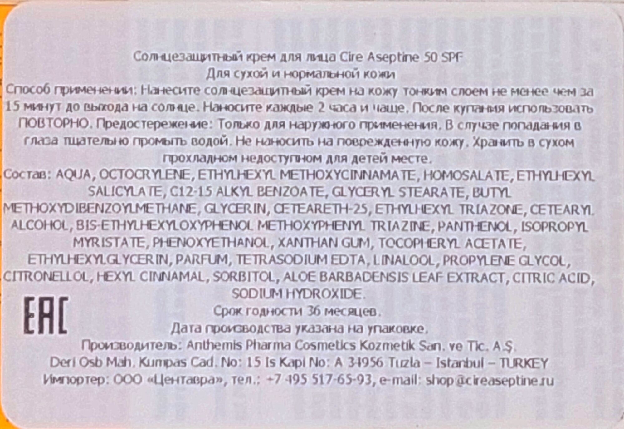 Солнцезащитный Крем Cire Aseptine, 50+ SPF, детский, для всех типов кожи, 150мл