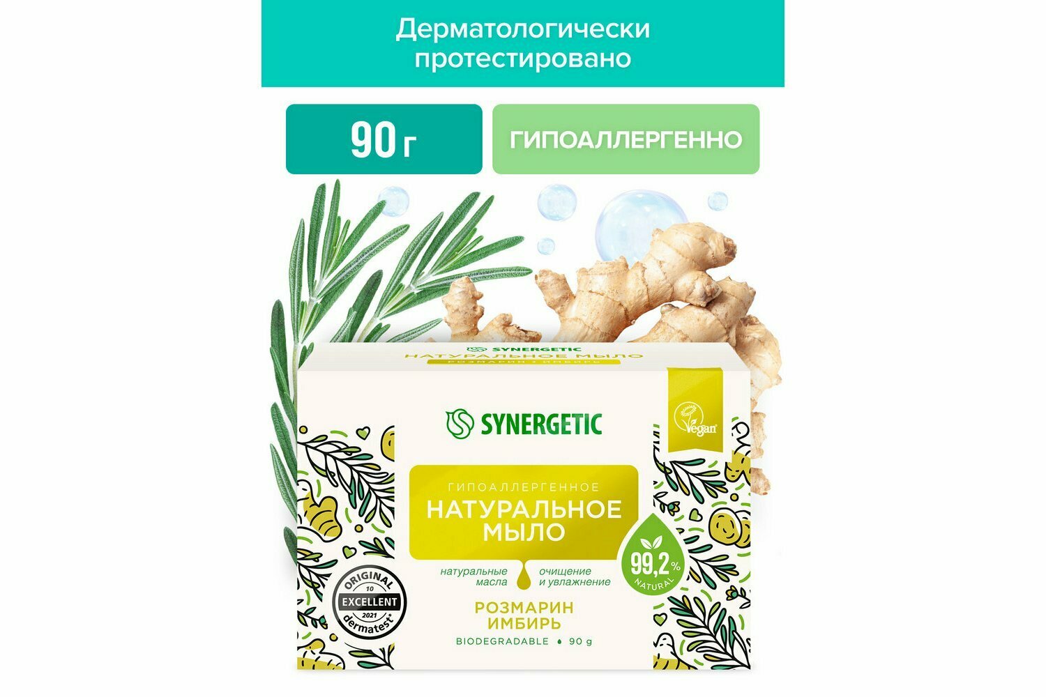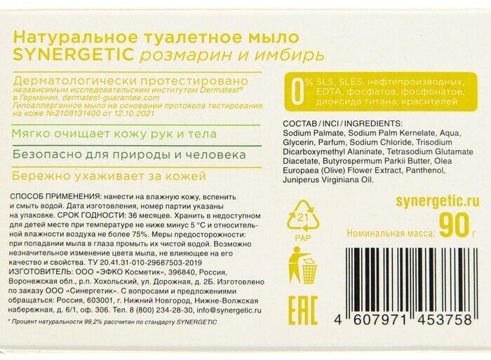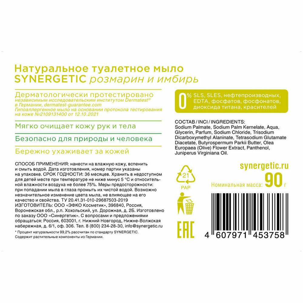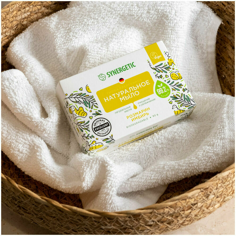 Купить Мыло твёрдое SYNERGETIC 90гр Натуральное Розмарин Имбирь