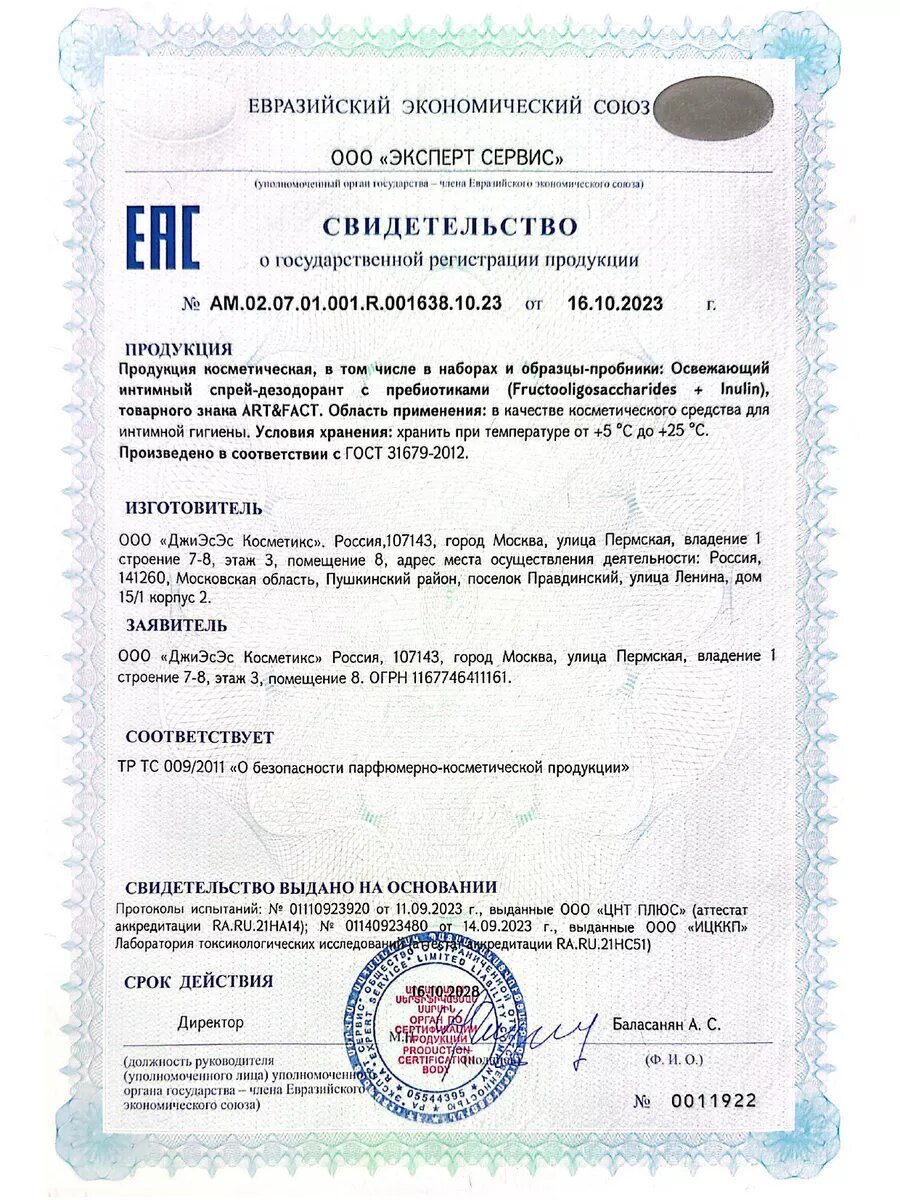 ART&FACT. Intimate Care/ Освежающий интимный спрей-дезодорант с пребиотиками, 150 мл