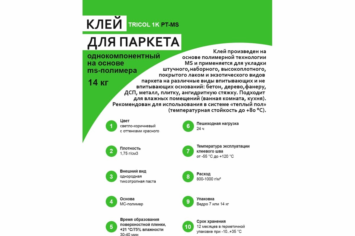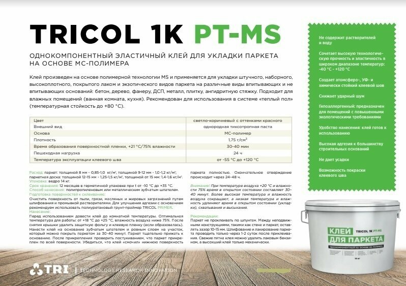 TRICOL 1K PT-MS Однокомпонентный жестко-эластичный силановый клей для укладки паркета на основе MC-полимера. , 14 кг