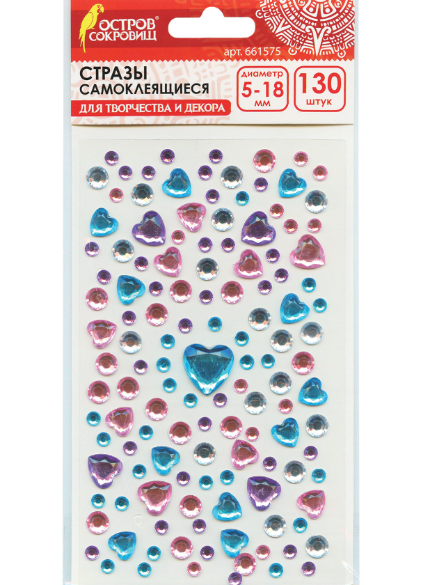 Стразы / наклейки клеевые самоклеящиеся для творчества Сердечки, ассорти, 5-18 мм, 130 шт., на подложке, Остров Сокровищ