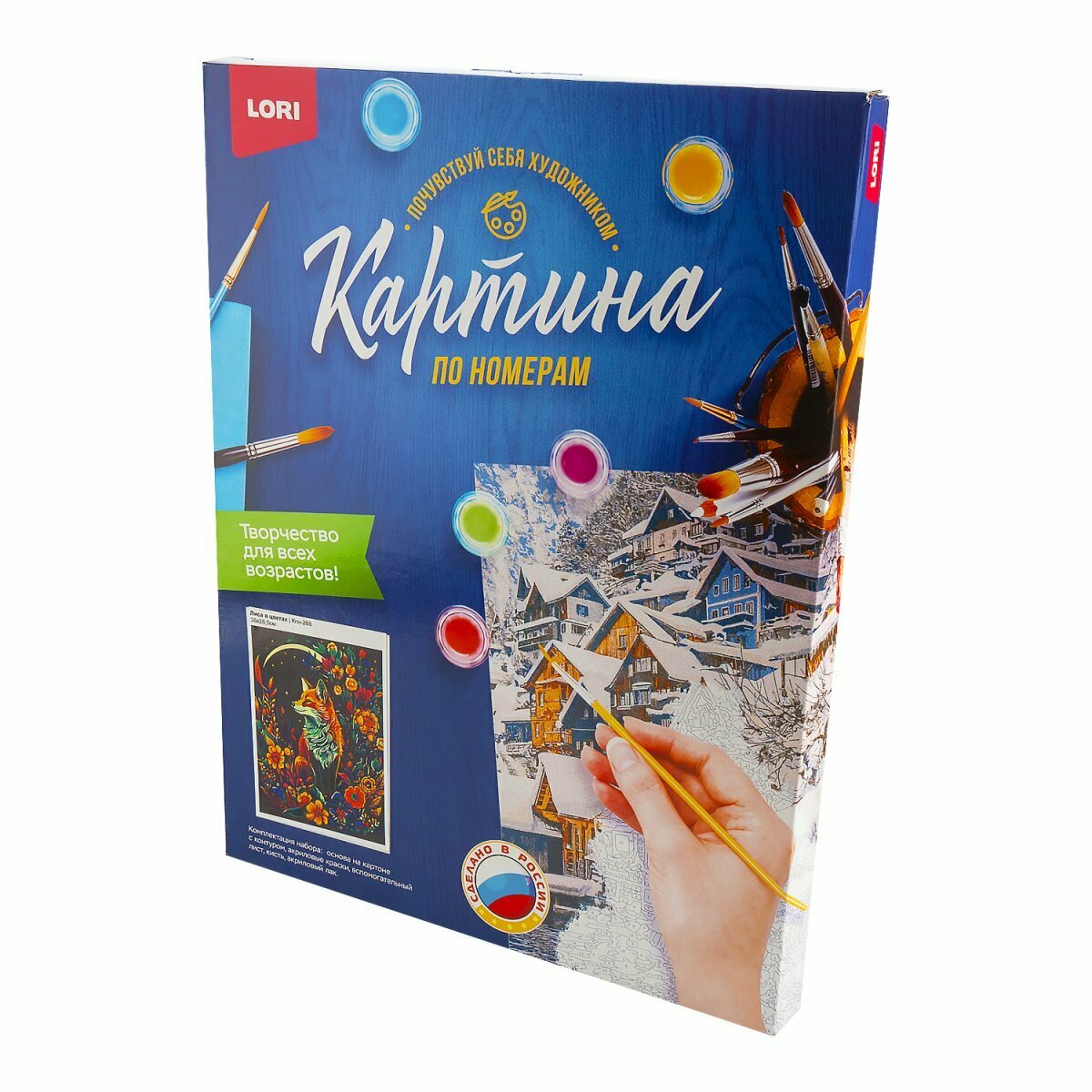 | Комплектация | основа на картоне с контуром изображения, акриловые краски, кисть, вспомогательный лист и акриловый лак. |