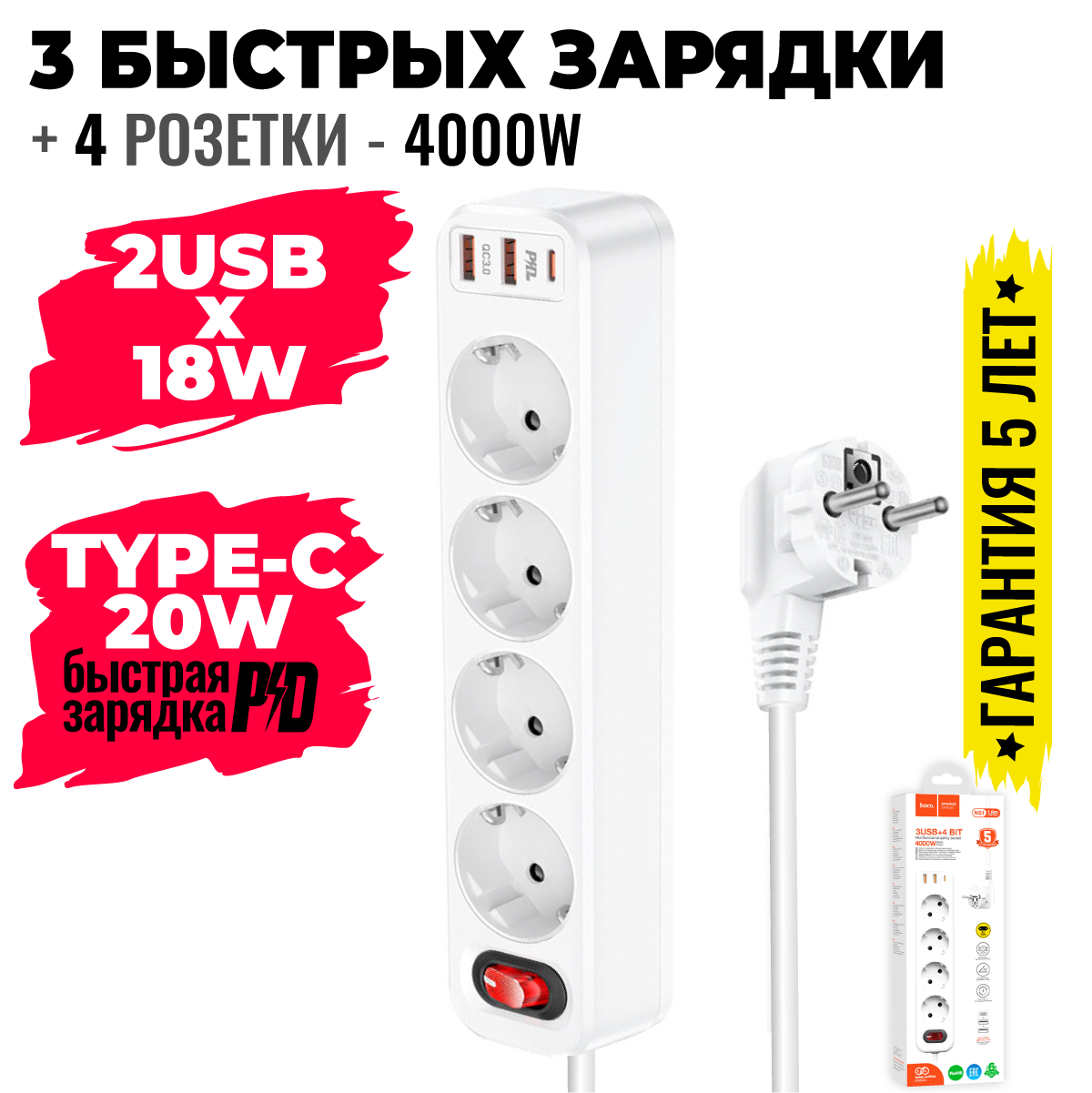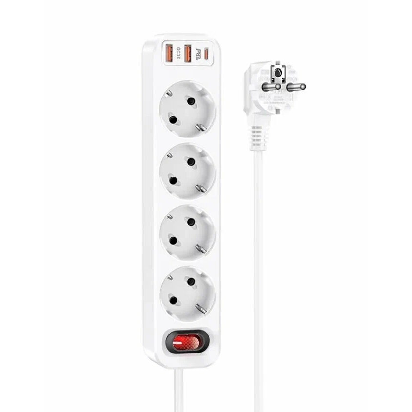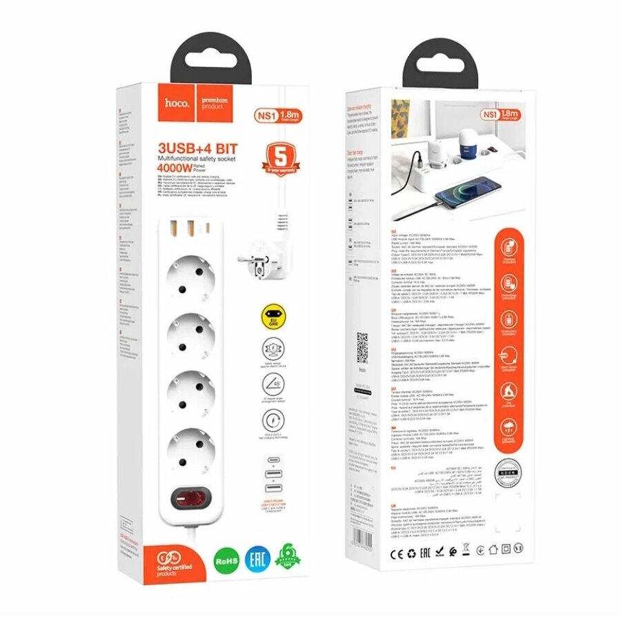 Сетевой фильтр на 4 розетки+2 USB+1 PD, 1.8м, NS1, HOCO, белый