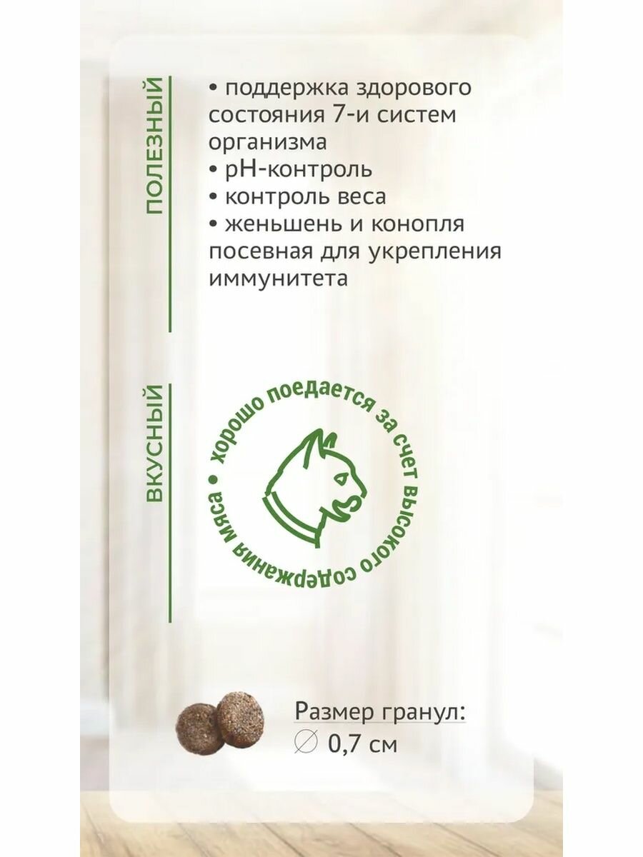 | Особые потребности | беззерновой / гипоаллергенный / для беременных / кормящих кошек / для вывода шерсти / для живущих в помещении / для живущих на улице / для здоровья кожи и блеска шерсти / для здоровья костей и суставов / для профилактики стресса / для стерилизованных/кастрированных / при чувствительном пищеварении / профилактика МКБ / профилактика зубного камня / профилактика избыточного веса |