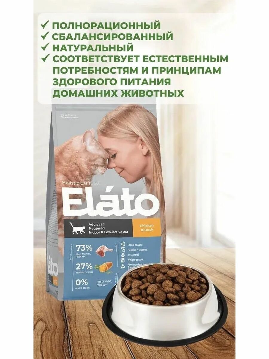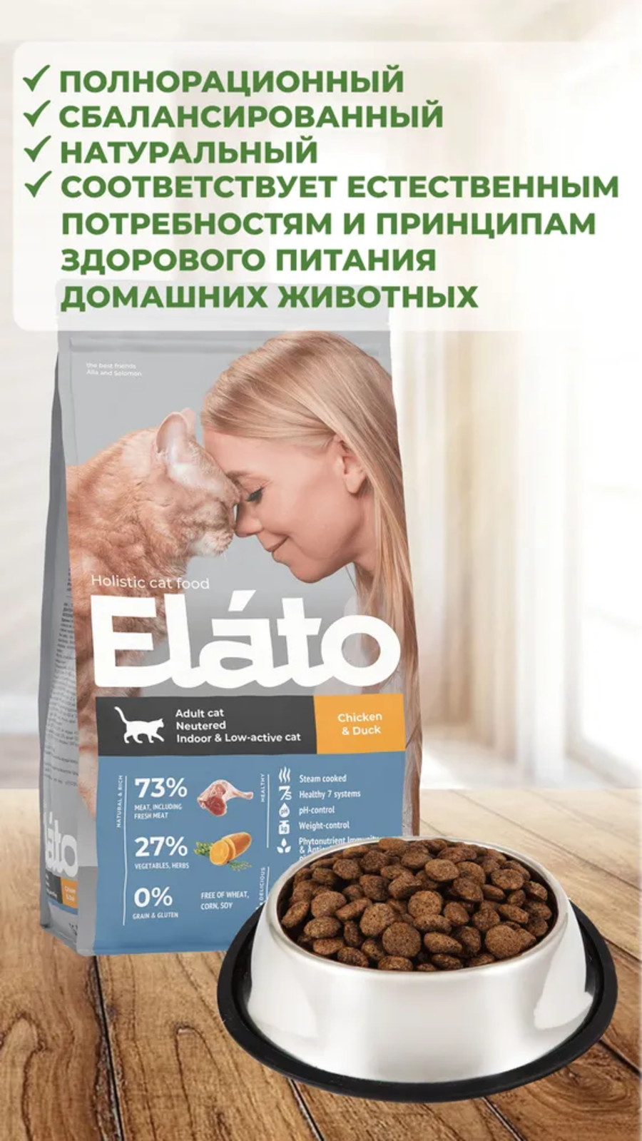 Elato Holistic сухой корм для кастрированных котов, стерилизованных и малоактивных кошек Курица и Утка 1,5кг