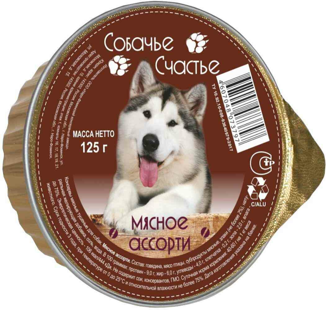 Собачье счастье консервы для собак Мясное ассорти 125г интересное: