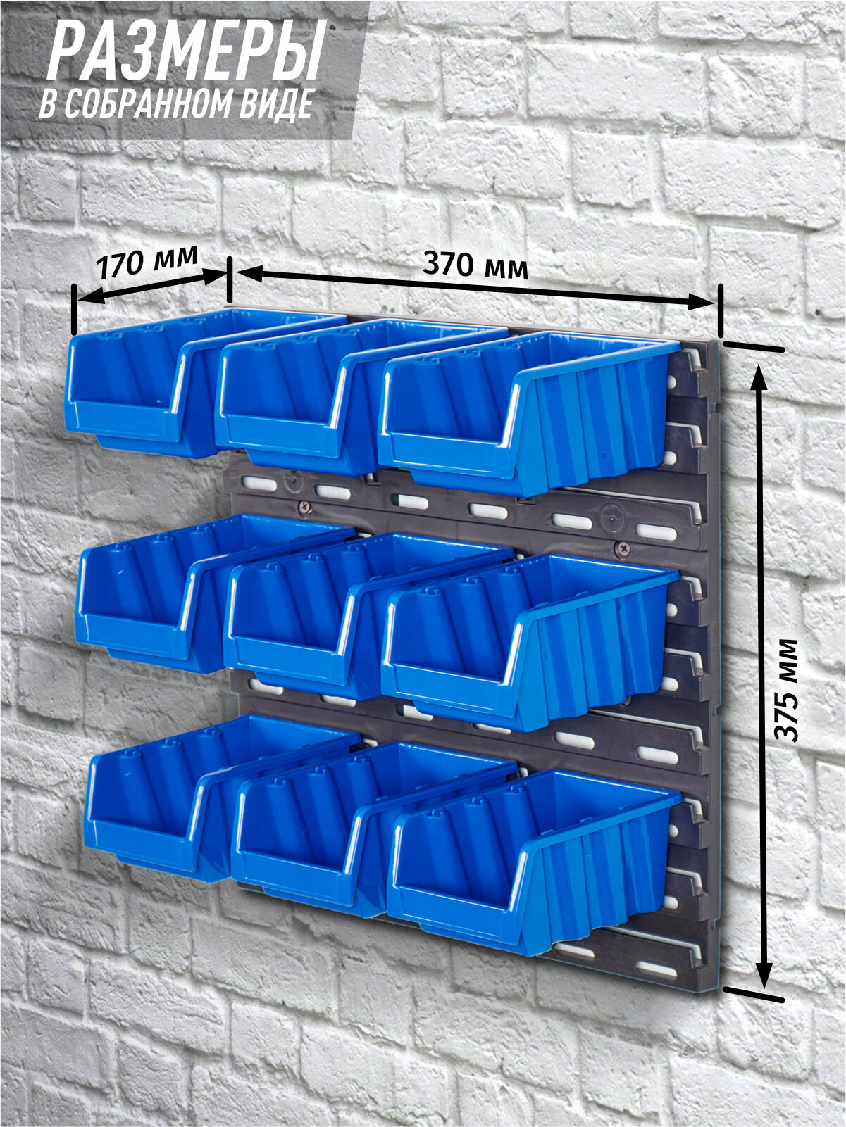 Органайзер для метизов пластиковый, на стену 9 лотков синий, черный 19,5х13,5х9 см, 37х37,5х2 см