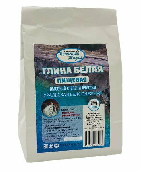 | Дополнительная информация | Белая пищевая глина (Каолин) - Пищевая добавка 100% природный продукт, экологичен и безопасен.Высокая степень очистки.Добывается на глубине более 45 метров в экологически чистом районе Урала.Богатый источник КРЕМНИЯ. Кремний отвечает за усвоение других микроэлементов. При дефиците кремния в пище организм перестаёт усваивать более 74% других микроэлементов.НАПОЛНЯЕТ ОРГАНИЗМ полезными минералами и микроэлементами, находящимися в её составе высокое содержания кремния более 40%, цинк, кальций, магний, калий, железо и др. |