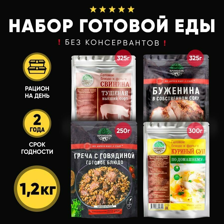 Кронидов Набор из 4 готовых блюд в реторт-пакете + Подарок БНП 1 шт. Свинина тушеная в/с, Буженина в с/с, Греча с говядиной, Суп куриный интересное: