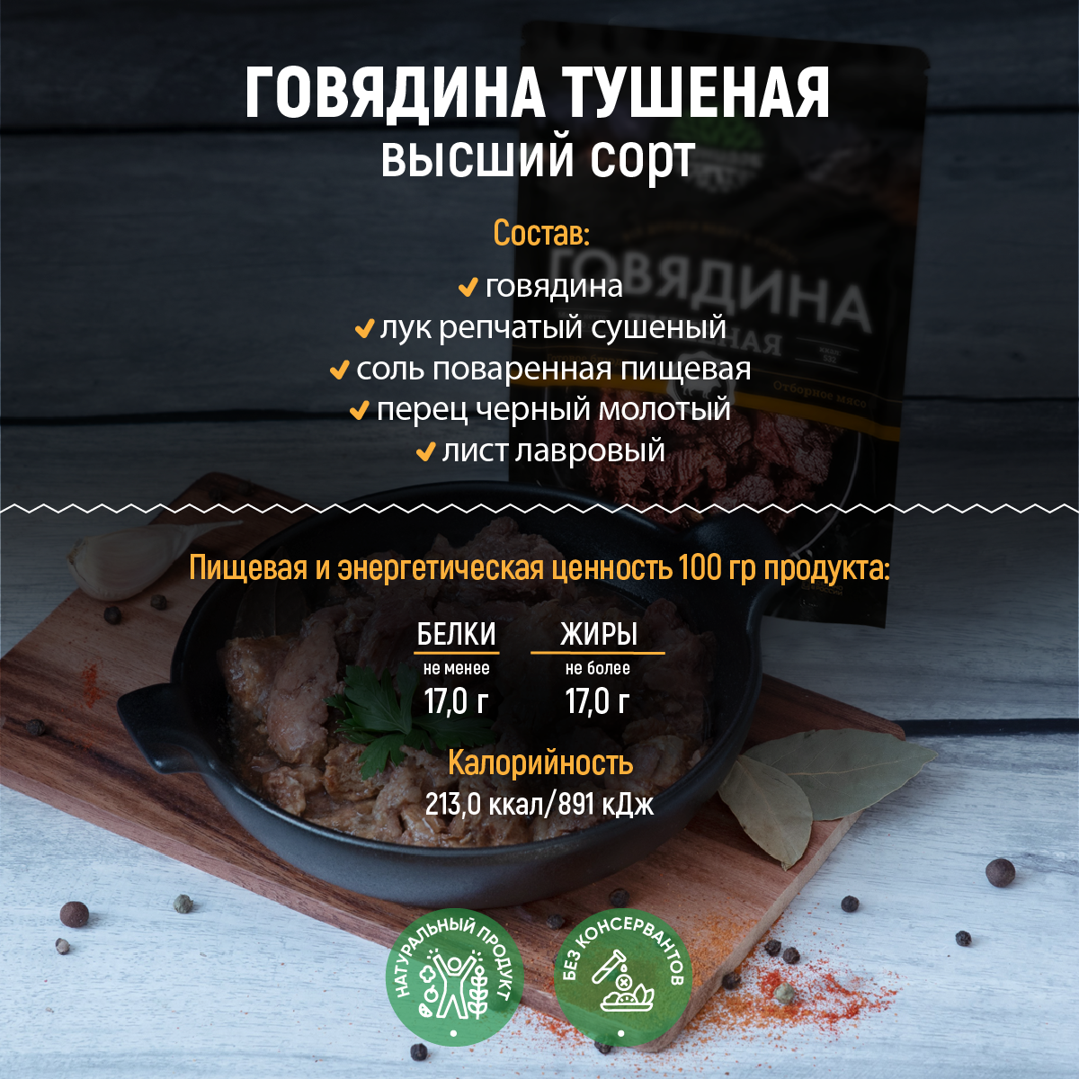Готовое блюдо в реторт-пакете "Говядина тушеная высший сорт" Кронидов. Сухой паек для охоты, рыбалки, в поход. Набор 2 шт. по 250гр.