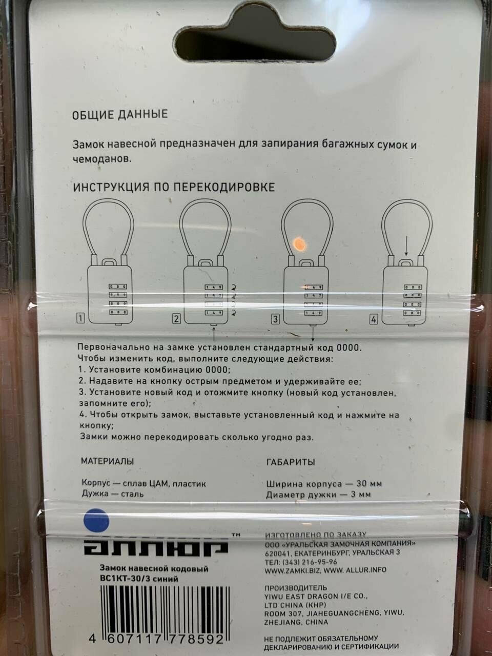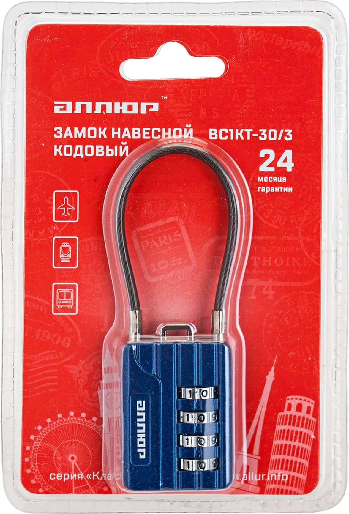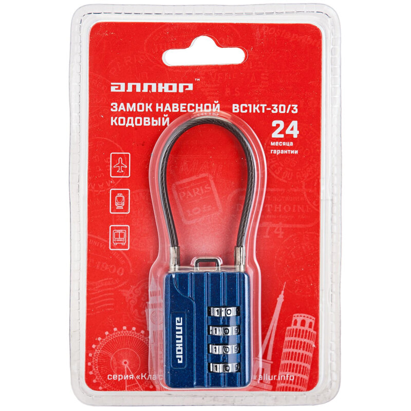 СохранитьЗамок навесной аллюр ВС1КТ-30/3 Синий с тросиком кодовый д.3мм для чемоданов интересное: