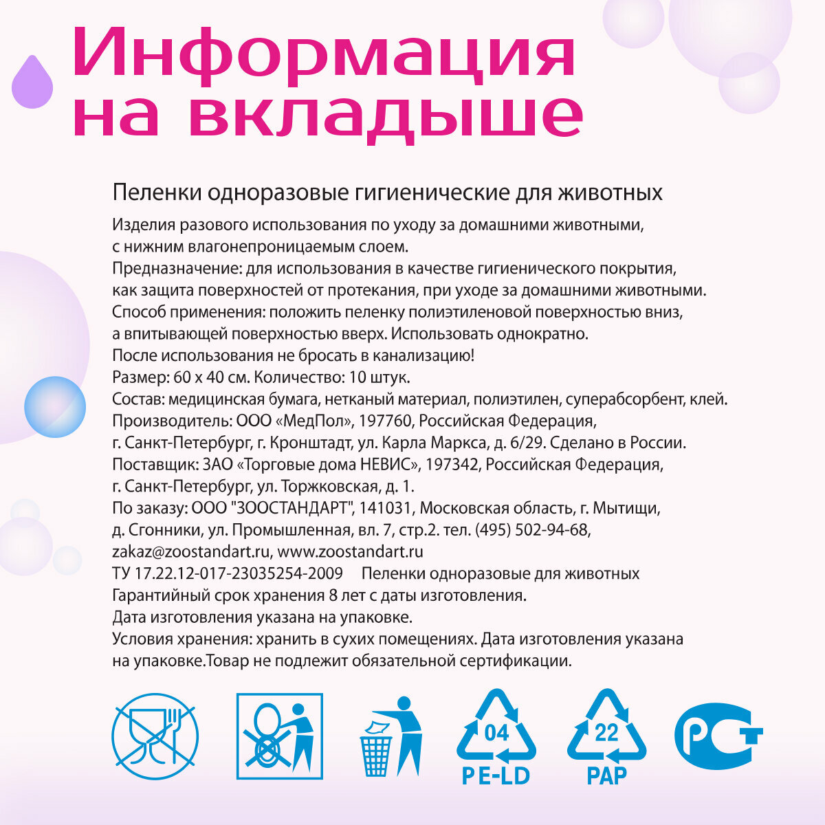 Пеленки впитывающие для животных ZOO няня супертонкие гелевые одноразовые 60х40 10шт интересное: