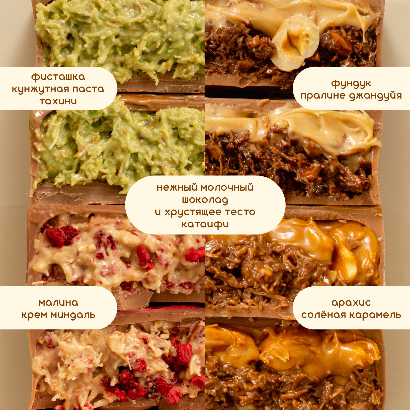 | Состав | Шоколад молочный (33%), шоколад белый (28%), фисташковая паста, сахар, кунжутная паста (таихини), тесто катаифи, орех фисташка |