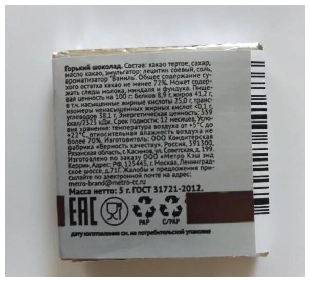 | Дополнительная информация | может содержать следы молока, миндаля, фундука |