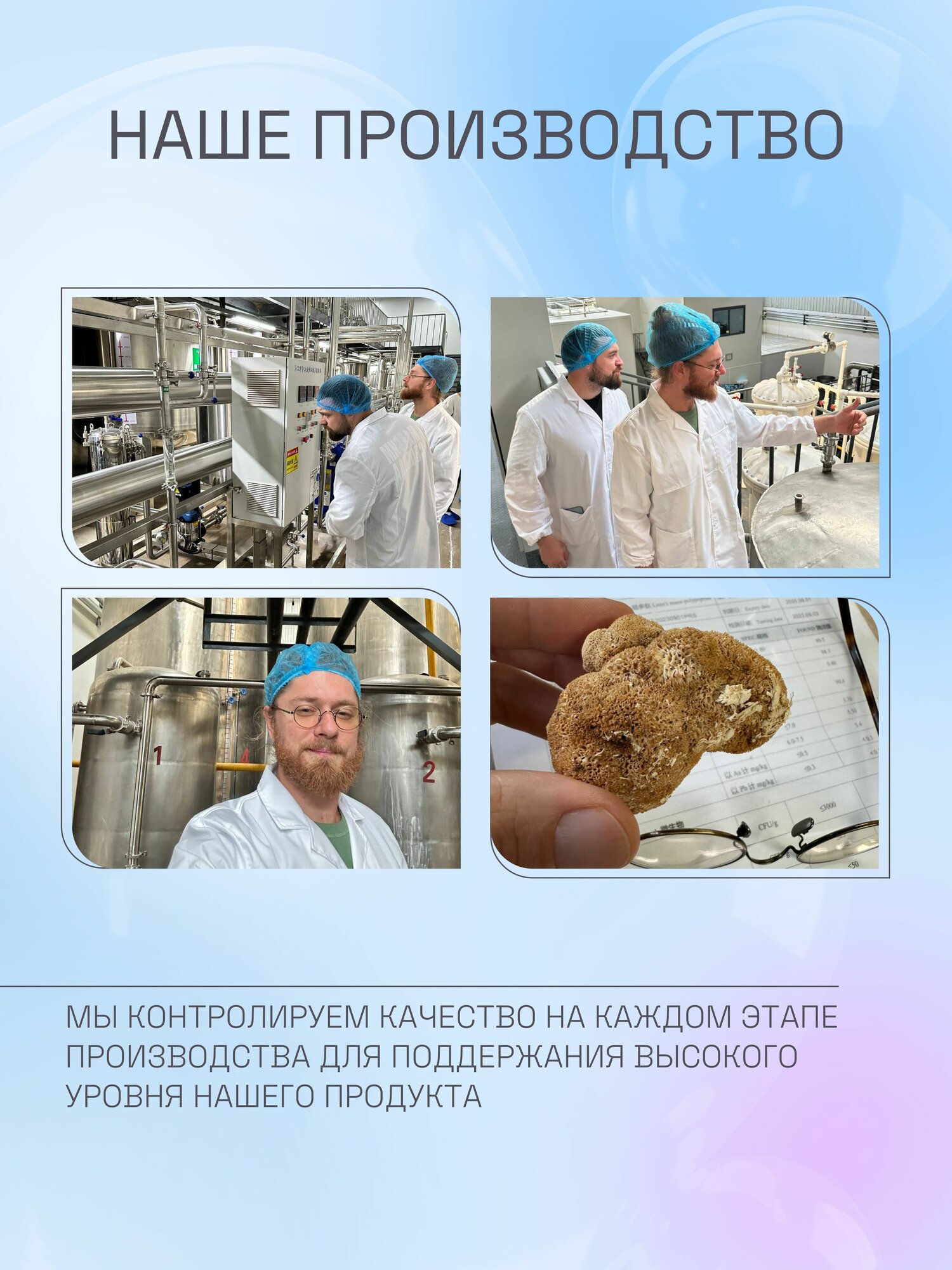 | Состав | Экстракт плодовых тел Ежовик гребенчатый, Экстракт мицелия Ежовик гребенчатый, Аскорбиновая кислота, Капсула желатиновая. |