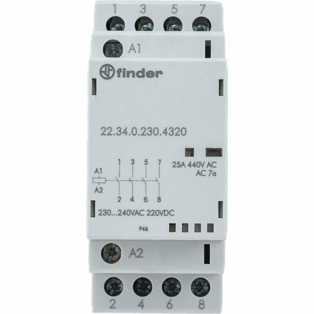 Finder Модульный контактор; 4NO 25А; контакты AgSnO2; катушка 230В АС/DC; ширина 35мм; степень защиты IP20; опции: мех. индикатор + LED