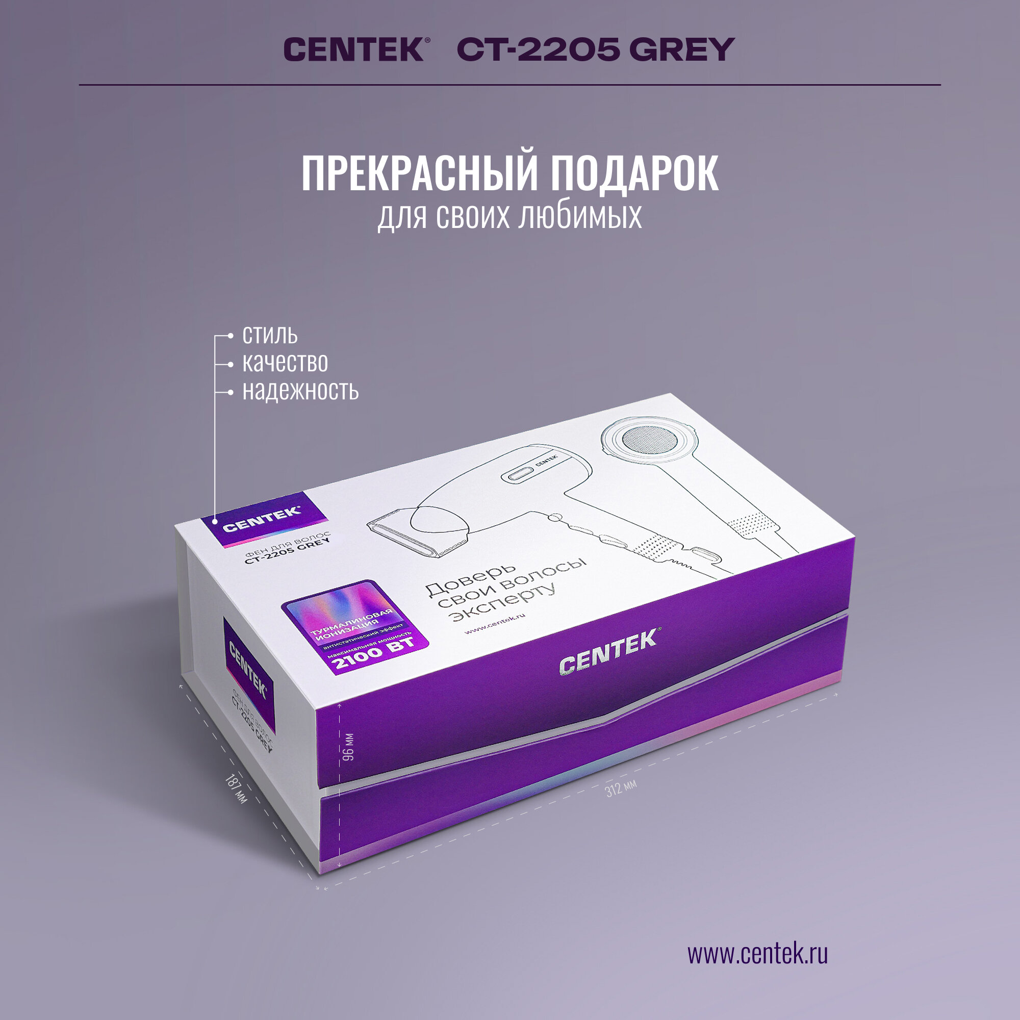 Купить Фен для волос профессиональный CENTEK CT-2205 Grey - 2100Вт/ 3 скорости/ 2 режима/ холод обдув/ турмалин.ионизация/ LED