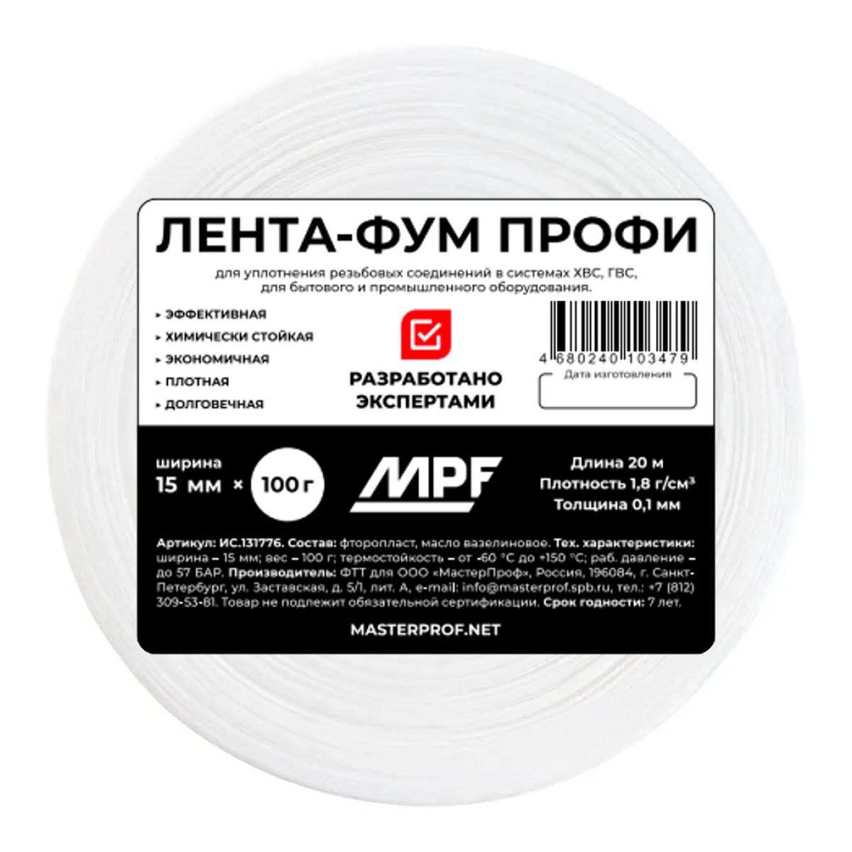Лента ФУМ фторопластовая для воды и газа MPF 15 мм x 0,1 мм x 20 м, профессиональная