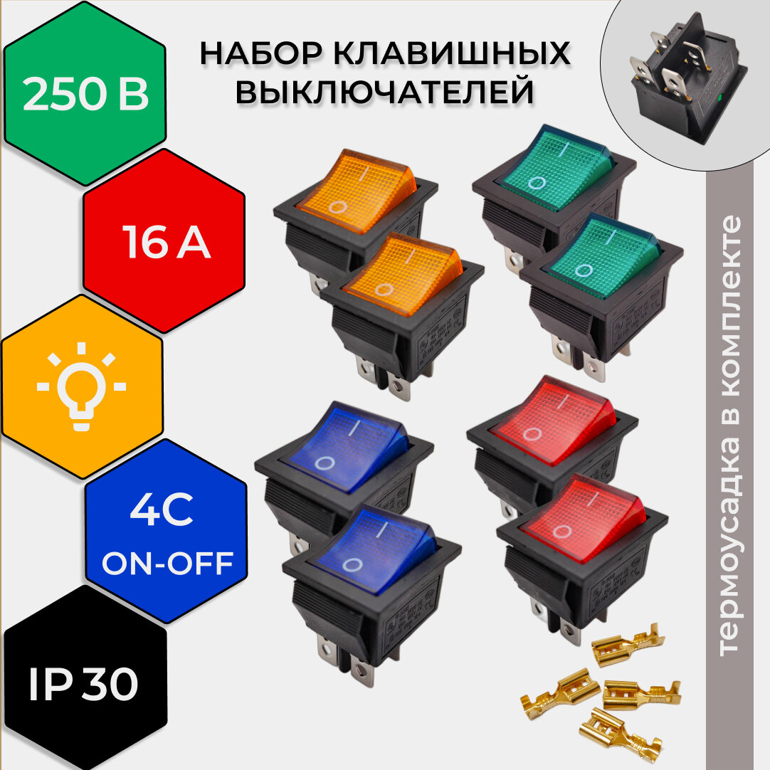 Купить Набор выключателей клавишных 250В STANDART с подсветкой 16А (4с) 8 шт./4 цвета (+ клеммы и термоусадка)
