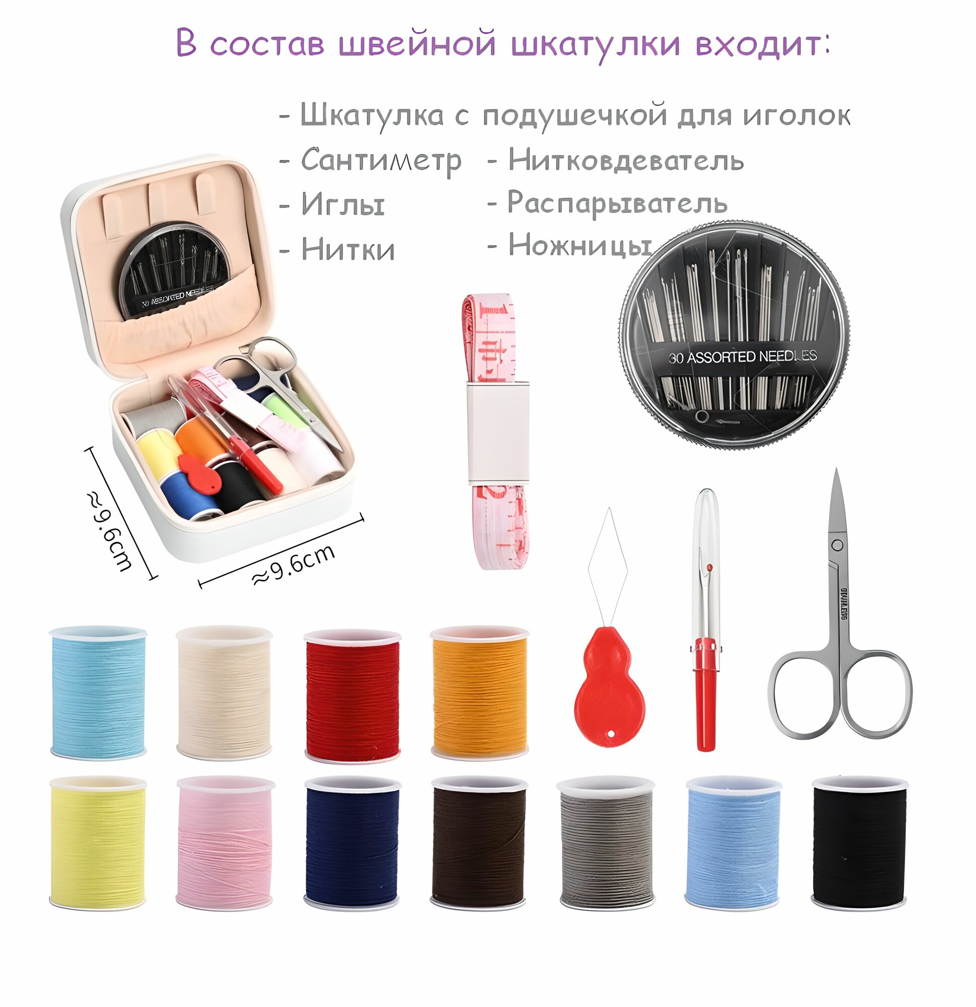 | Подробная комплектация | набор иголок и игольница, нитки разных цветов, сантиметр, кнопки и портновские ножницы. |