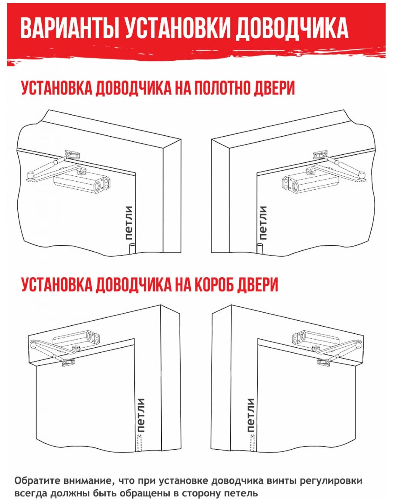 | Дополнительная информация | назначение: для установки на деревянные, пластиковые и металлические двери; скорость закрывания регулируется двумя независимыми клапанами; фиксация положения |