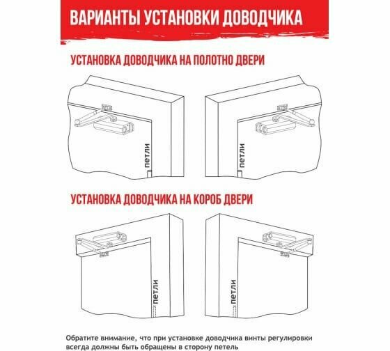 | Дополнительная информация | назначение: для установки на деревянные, пластиковые и металлические двери; скорость закрывания регулируется двумя независимыми клапанами; фиксация положения |