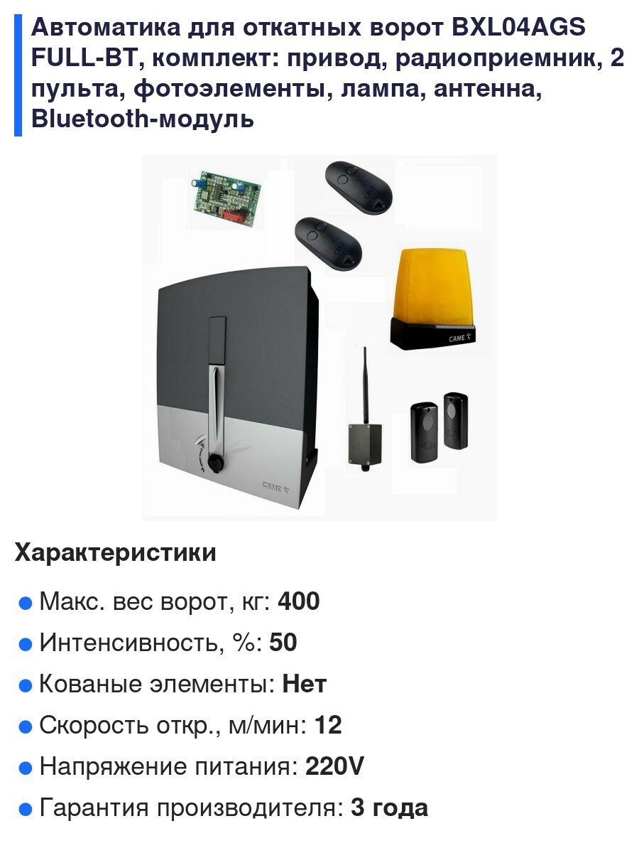 Автоматика для откатных ворот BXL04AGS FULL-BT, комплект: привод, радиоприемник, 2 пульта, фотоэлементы, лампа, антенна, Bluetooth-модуль интересное: