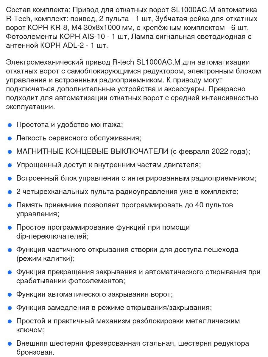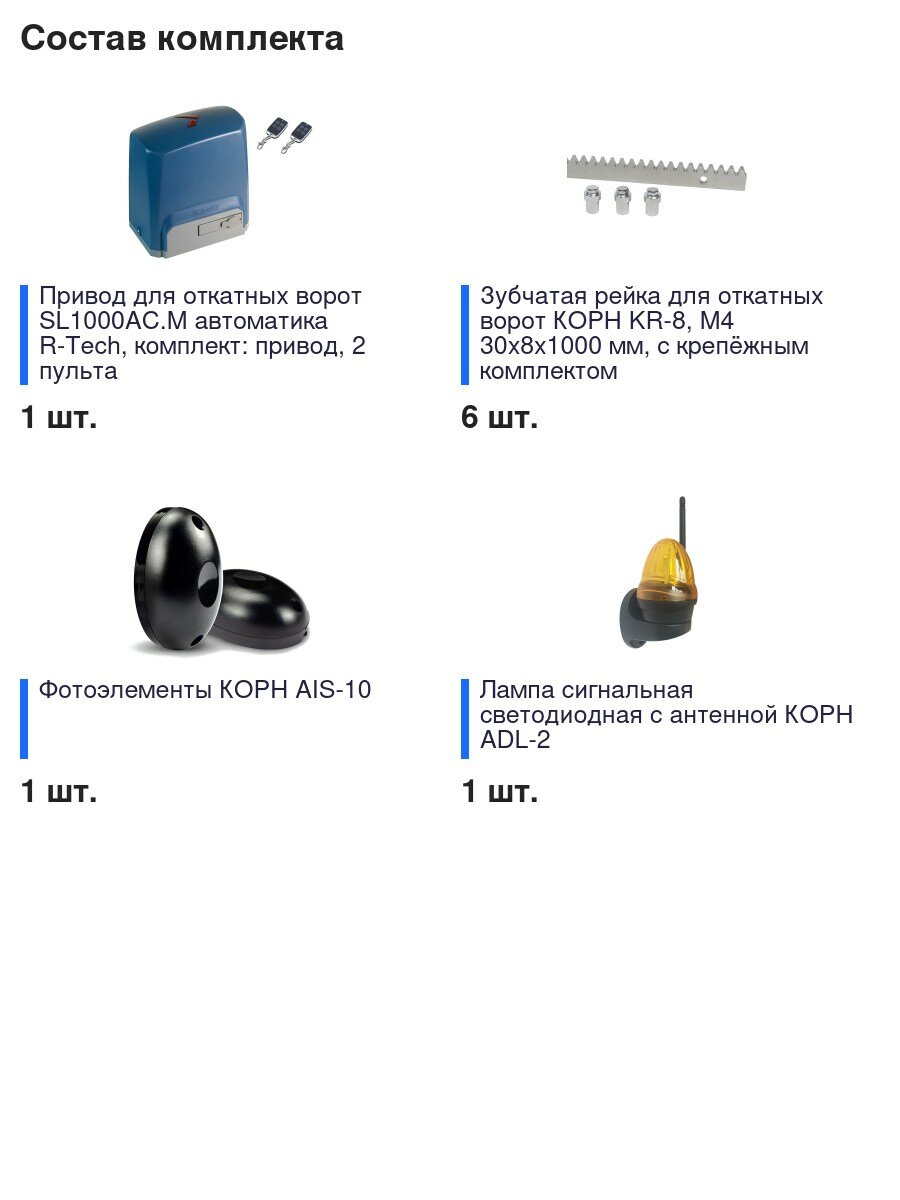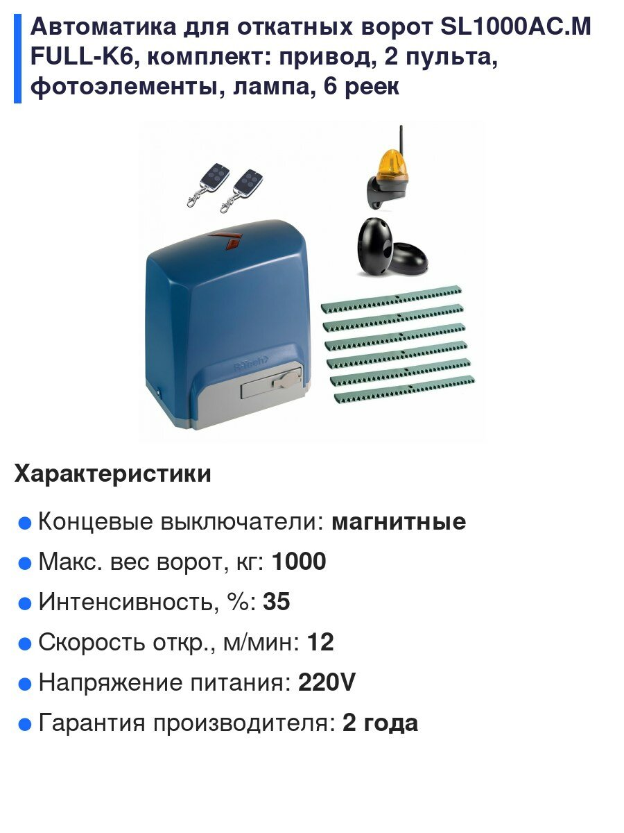 Автоматика для откатных ворот SL1000AC.M FULL-K6, комплект: привод, 2 пульта, фотоэлементы, лампа, 6 реек интересное: