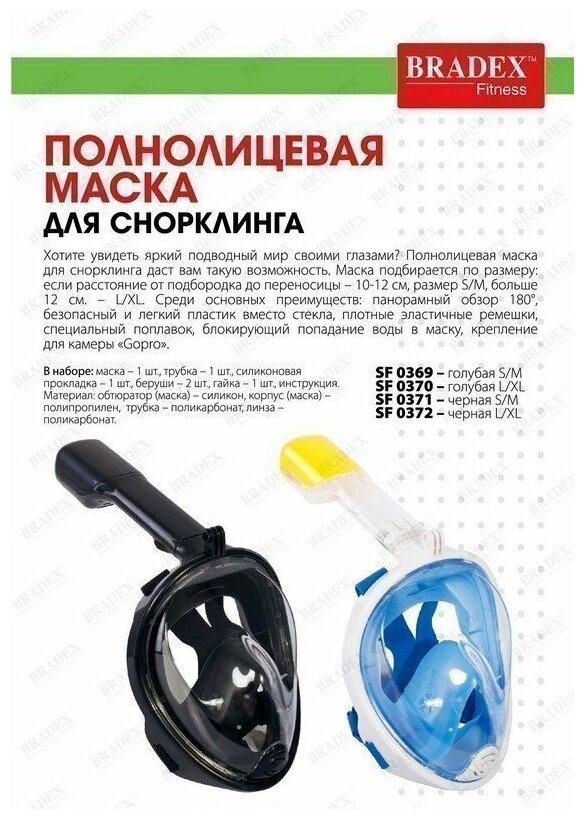СохранитьМаска Bradex полнолицевая для снорклинга, голубая L интересное: