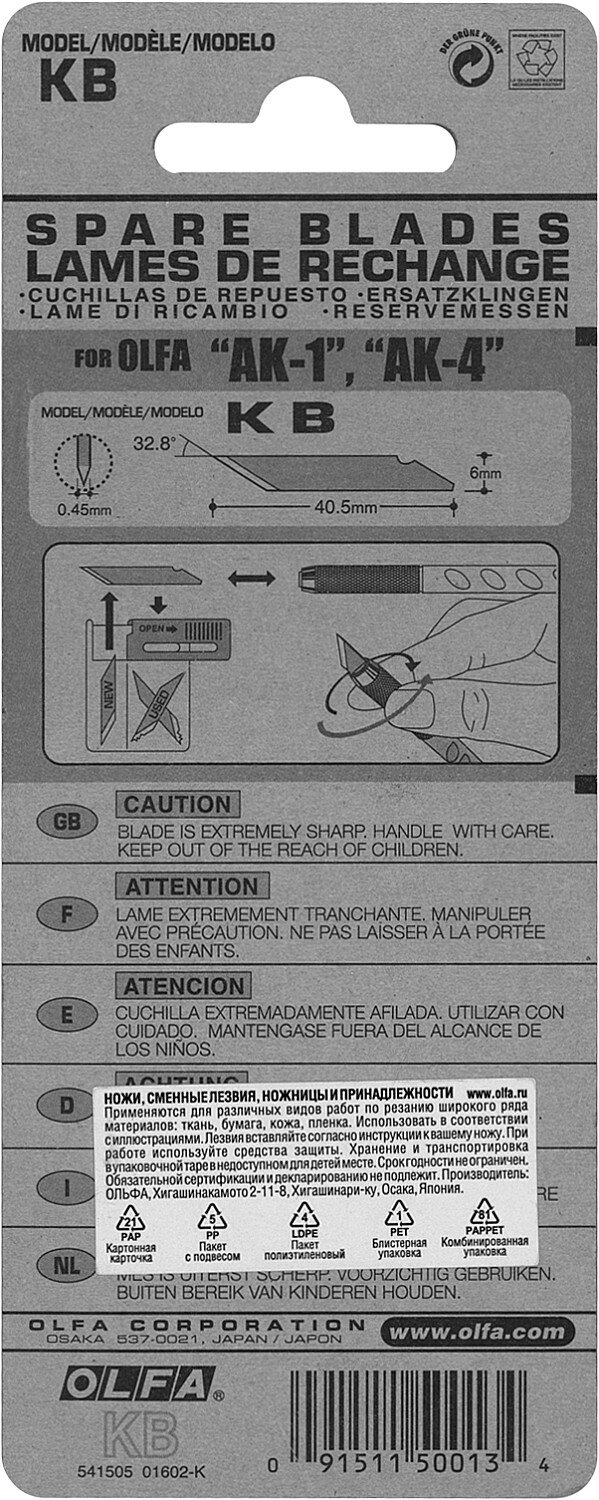 | Дополнительная информация | ширина рабочей зоны: 11 мм; двугранная заточка лезвия; подходит для OLFA AK-1/5B, AK-4 |
