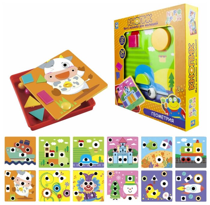 Мозаика для малышей 1toy Игродром. Кнопик Геометрия, 24 фигурки,12 трафаретов T16699