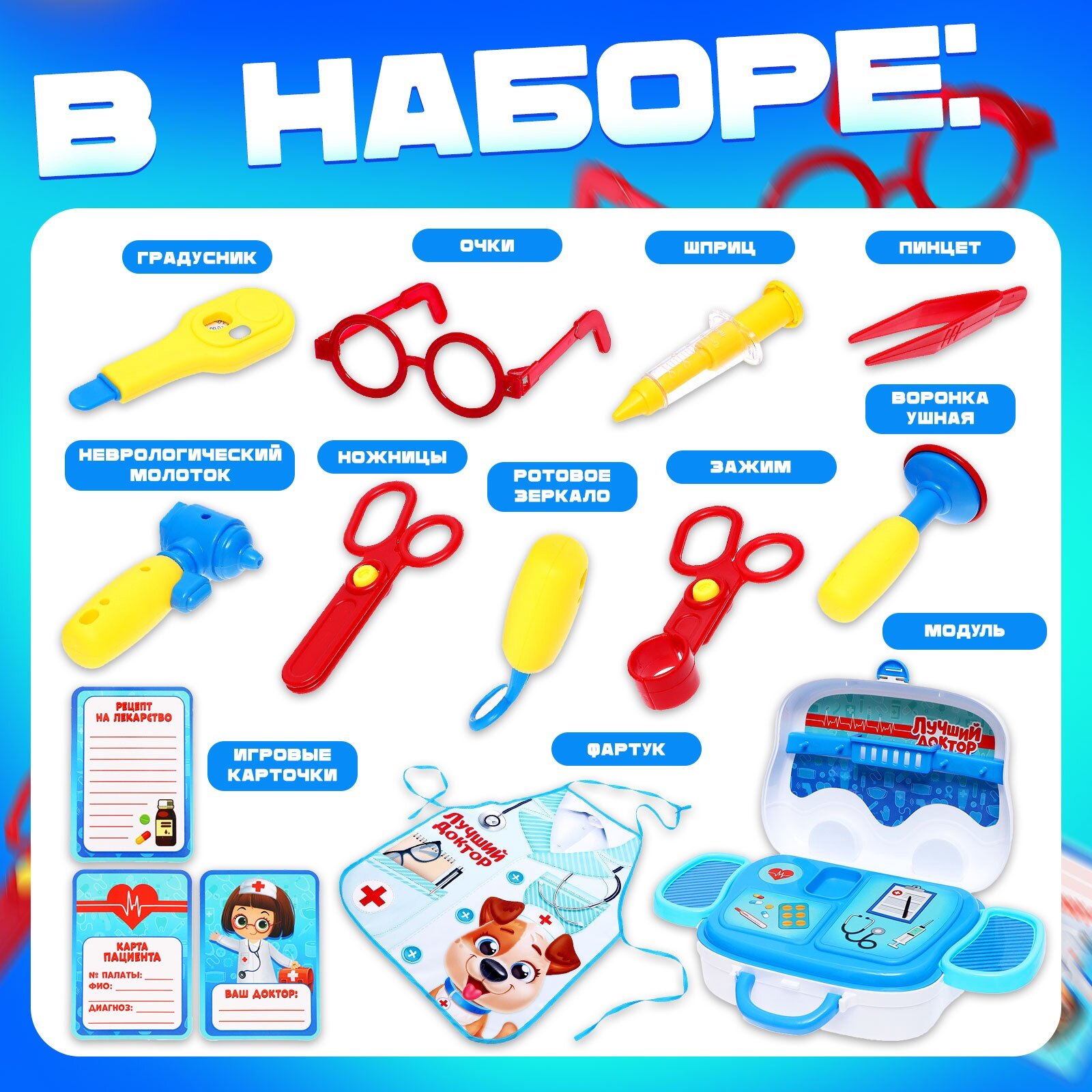 | Дополнительная информация | С набором доктора у ребёнка будет всё нужное, чтобы лечить кукол и плюшевых зверей. Разнообразные предметы сделают знакомство с профессией врача увлекательным. Особенности набора Раскладной ящик помогает хранить все нужные инструменты в одном месте. На игровых карточках удобно вести базу пациентов и записывать истории болезни. Фартук подходит для лечения пациентов, занятий творчеством с использованием сухих материалов: пластилина, цветных мелков, кинетического песка и др. Развиваемся играя Представив себя доктором, ребёнок освоит социальные роли, получит новые знания о важных профессиях, станет внимательнее и заботливее. Такая игра не только пробудит фантазию юного специалиста, но и поспособствуют развитию эмоционального восприятия. |