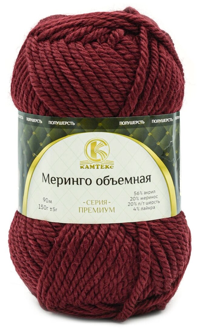 Пряжа для вязания Камтекс 'Меринго объемная', 150г, 90м (20% меринос, 20% полутонкая шерсть, 56% акрил, 4% лайкра) (047 бордо), 4 мотка