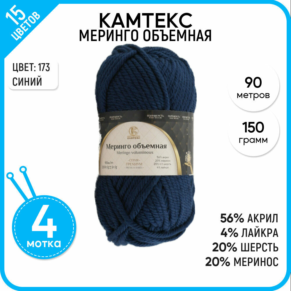 Купить Пряжа Камтекс "Меринго объемная", 150 гр 90 м, 20% меринос, 20% полутонкая шерсть, 56% акрил, 4% лайкра, 173 синий, 4 шт