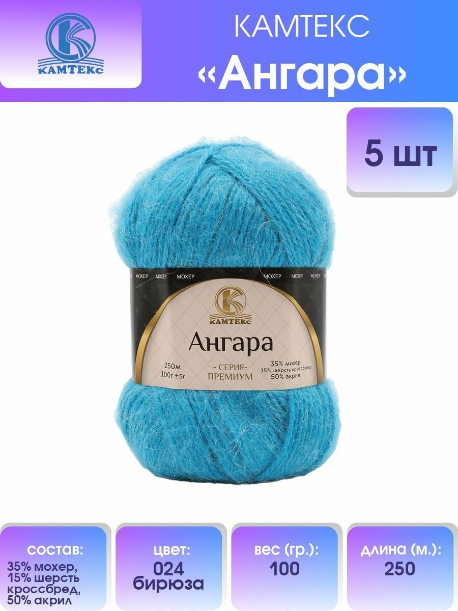 Пряжа Камтекс Ангара бирюза (024), 35%мохер/15%шерсть/50%акрил, 250м, 100г, 2шт