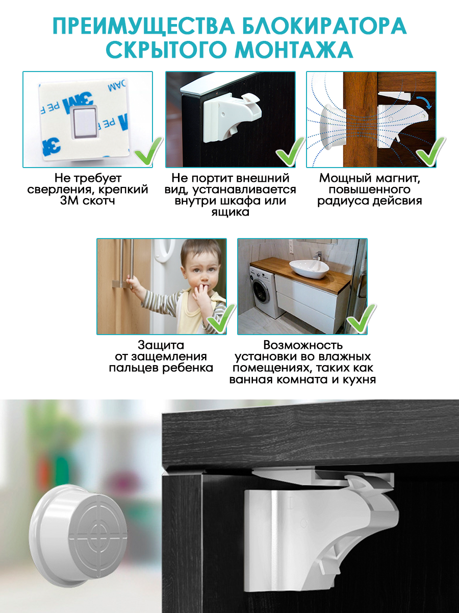 СохранитьМагнитный защитный замок блокиратор на дверцу шкафа, комплектация 4 замка и 1 ключ интересное: