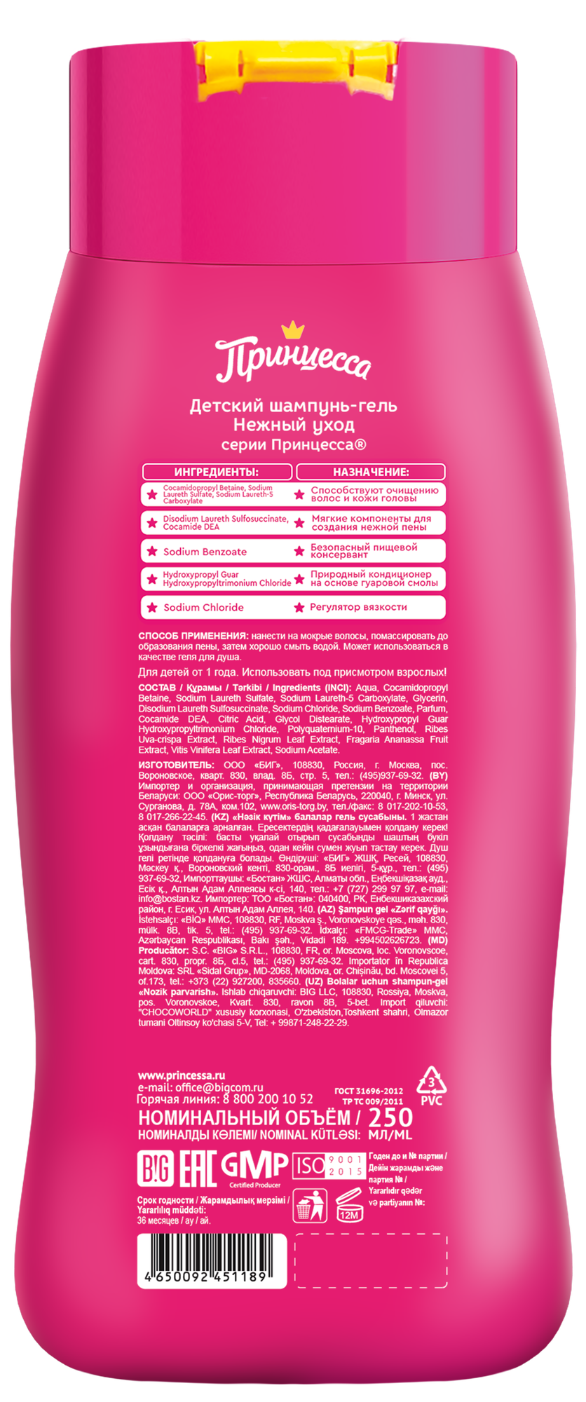 Шампунь-гель для ухода за волосами принцесса нежный уход, 250 мл