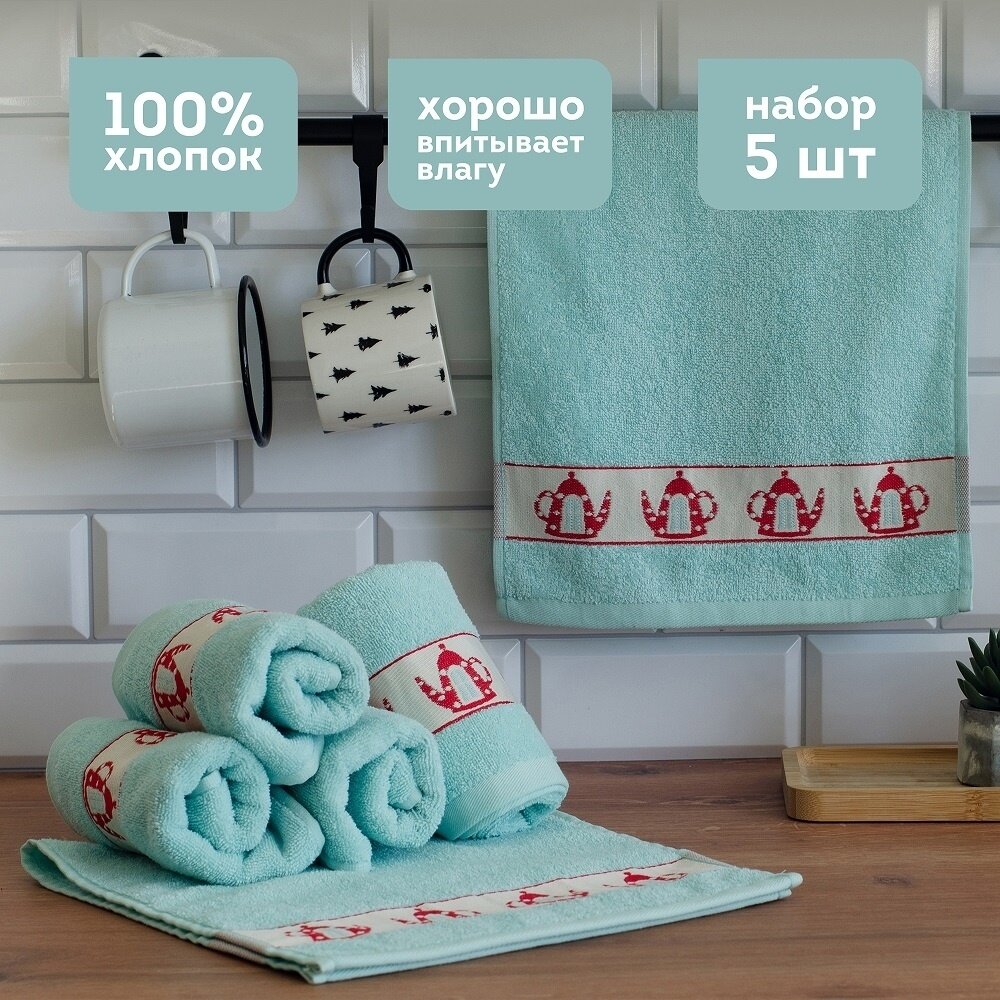 Полотенца махровые кухонные, 30х60 см, набор 5 шт, Китчен Тепло дома, бирюзовые