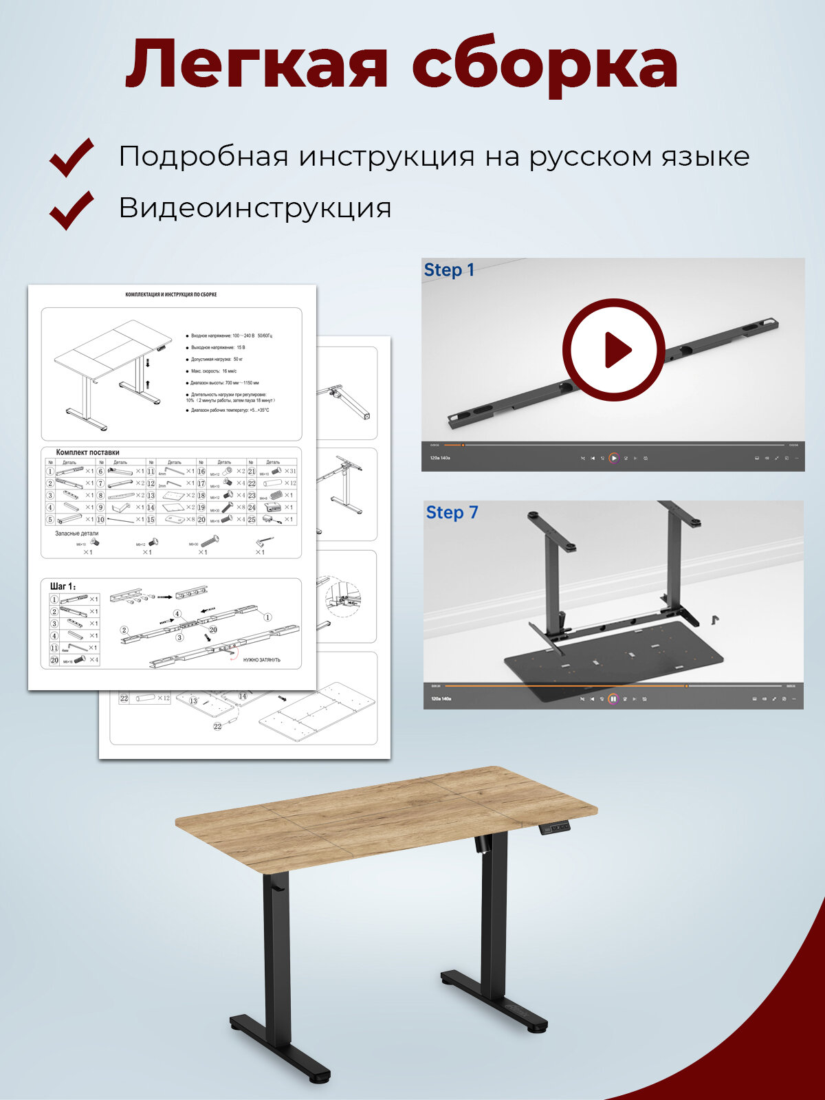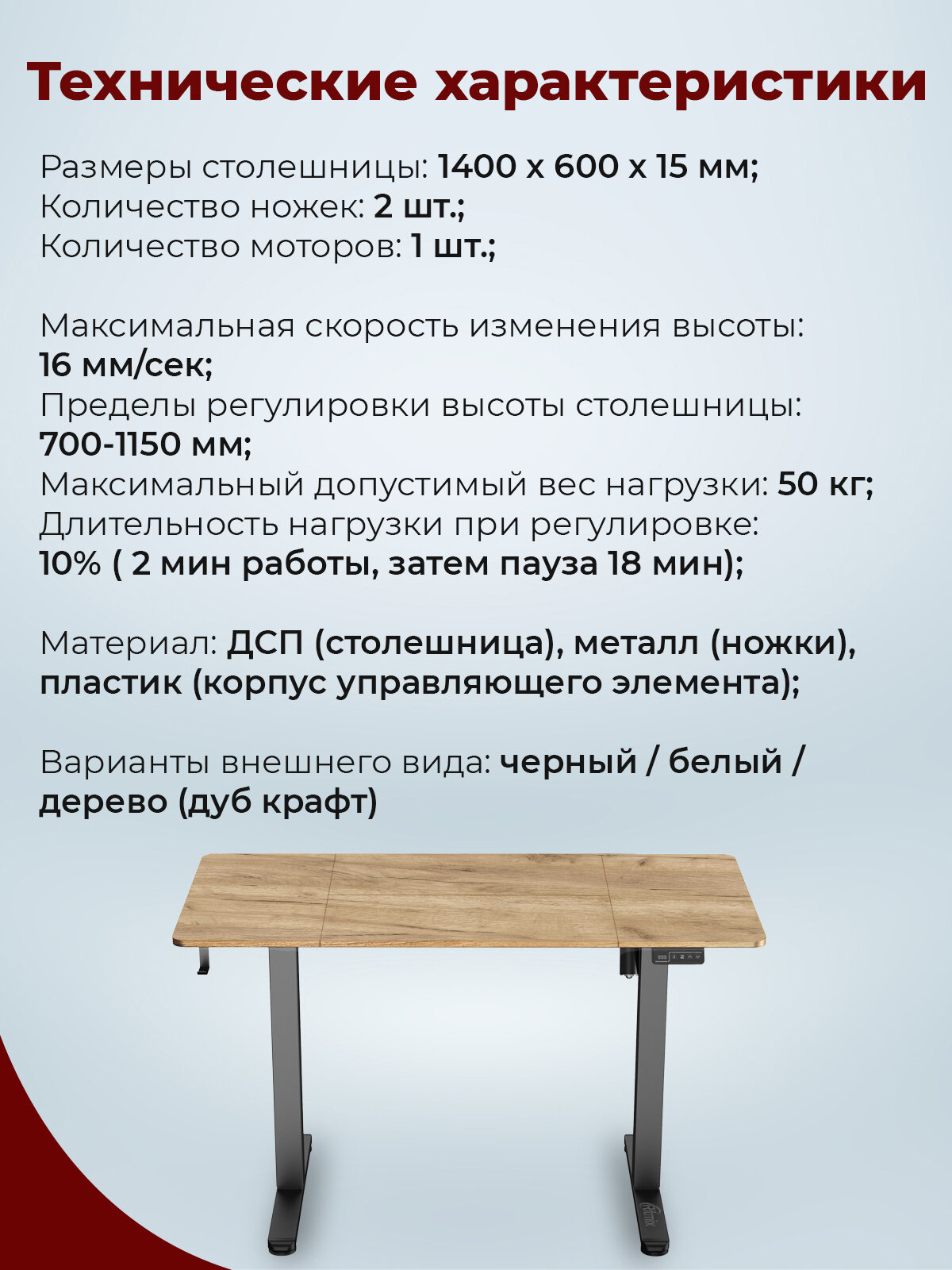 | Дополнительная информация | Размеры столешницы 1200х600х15 мм. Количество ножек 2 шт. Количество моторов 1 шт. Максимальная скорость изменения высоты 16 мм/сек. Пределы регулировки высоты столешницы 700-1150 мм. Максимальный допустимый вес нагрузки 50 кг. |