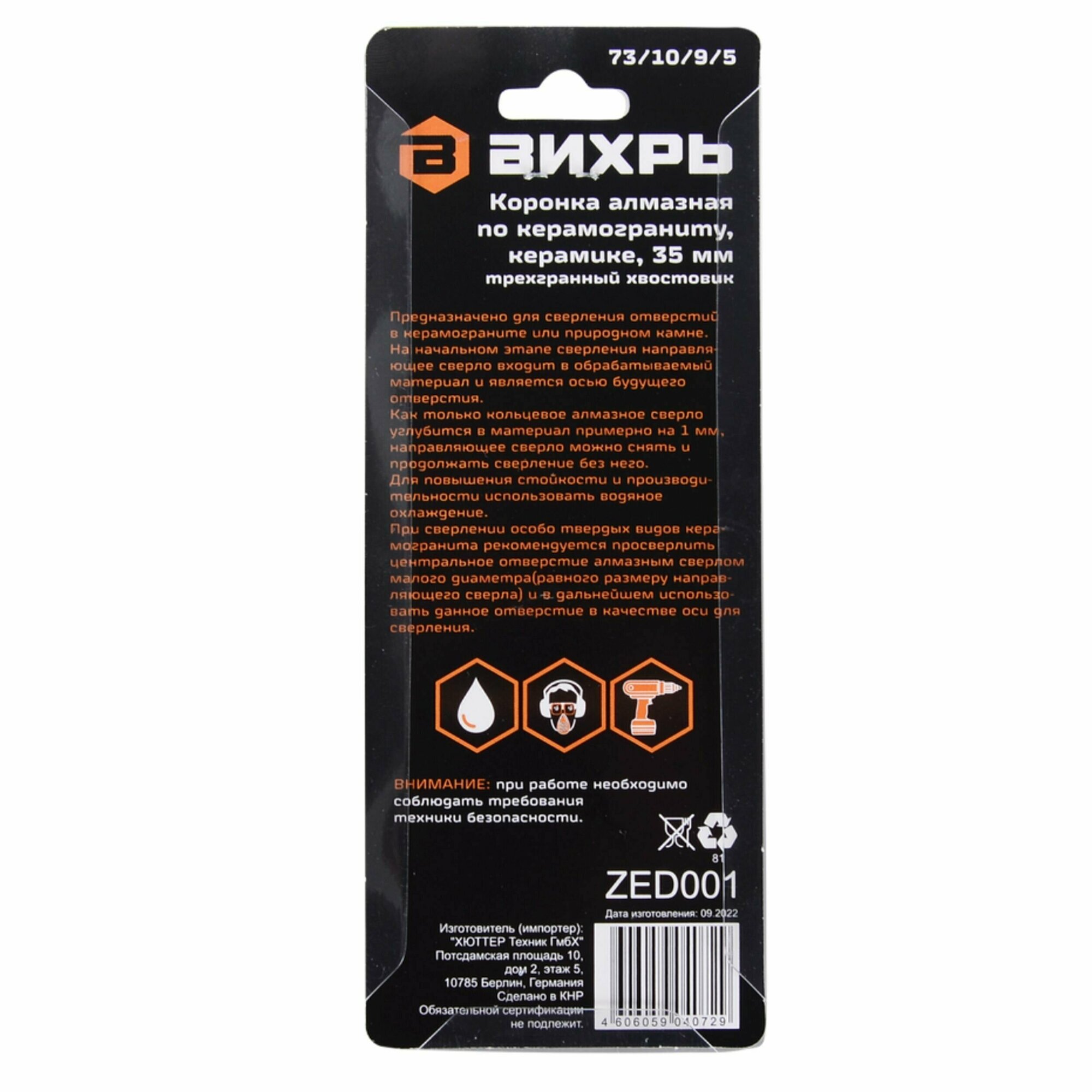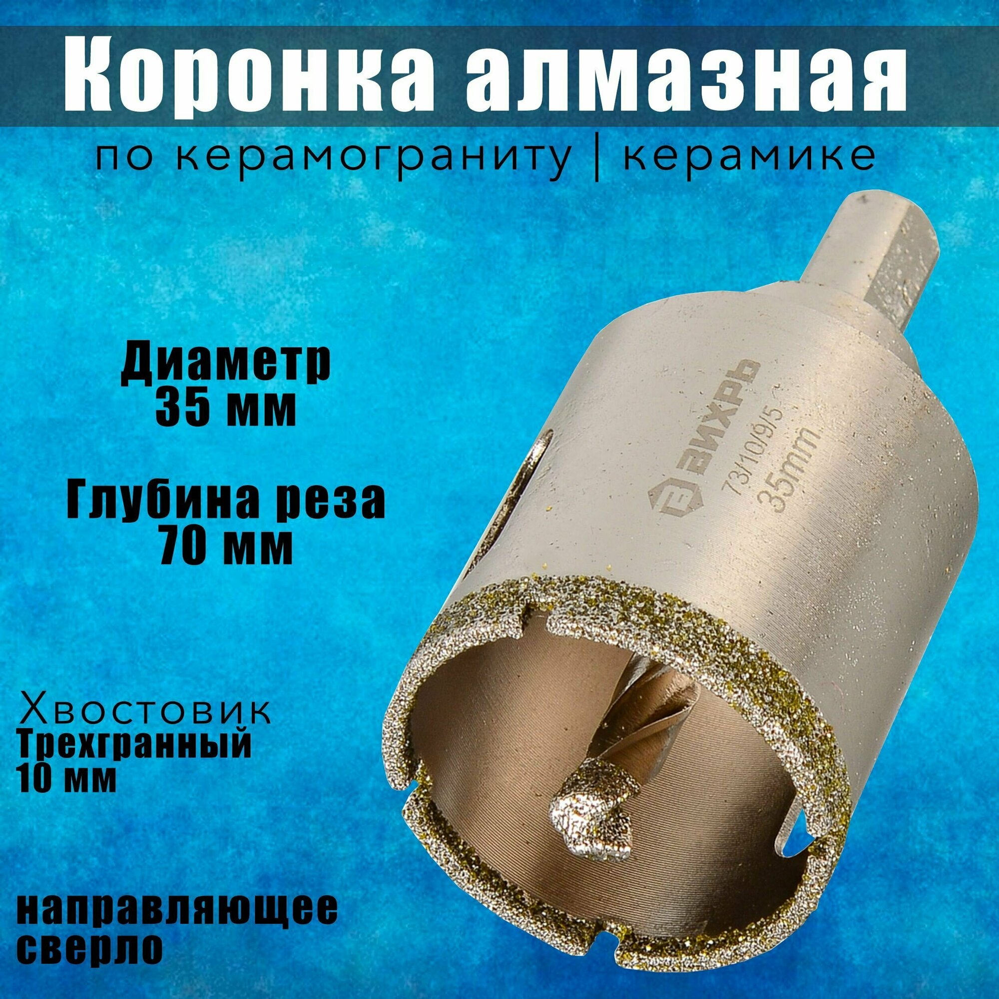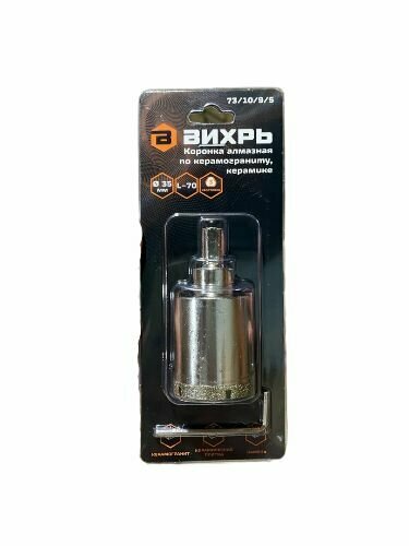 Коронка алмазная Вихрь по керамограниту/керамике 35 мм, 73/10/9/5