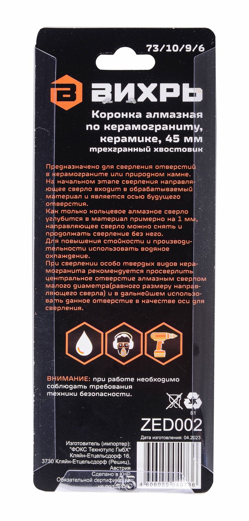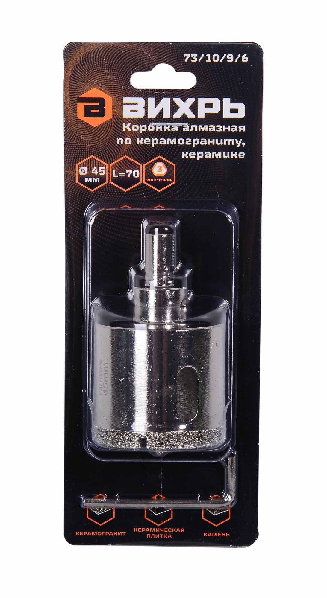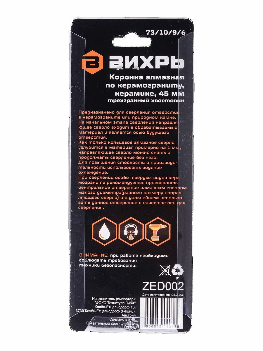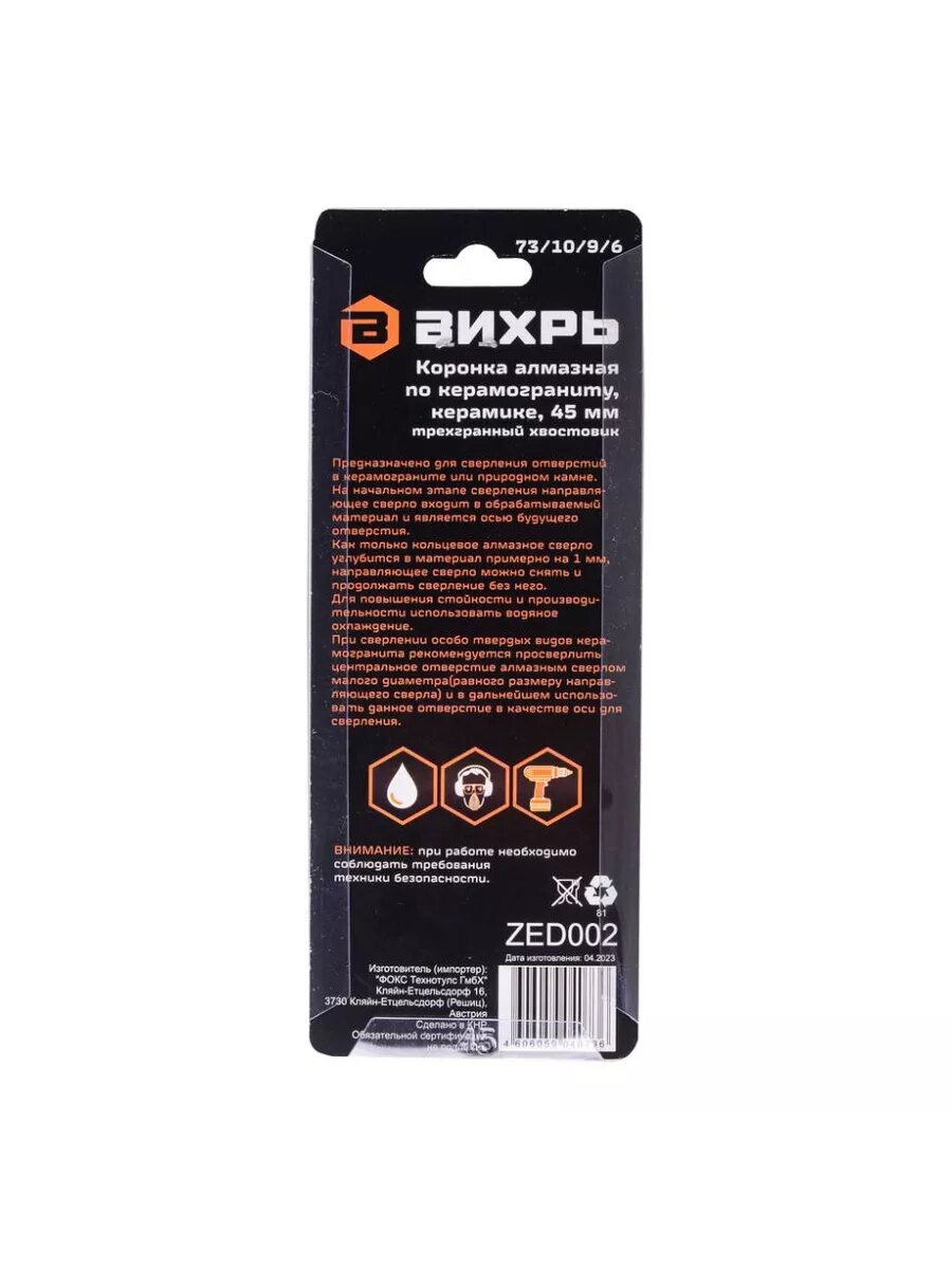 Купить Коронка алмазная Вихрь по керамограниту/керамике 45 мм, 73/10/9/6