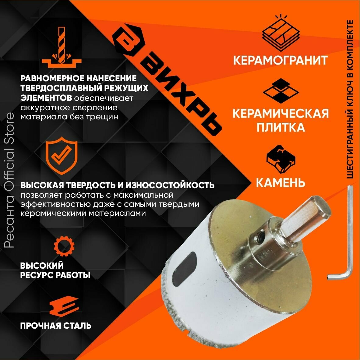 Коронка алмазная Вихрь по керамограниту/керамике 35 мм, 73/10/9/5