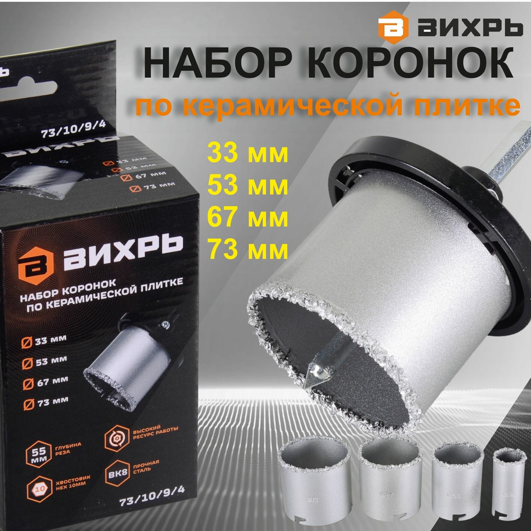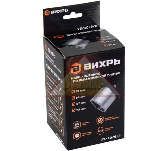 Набор коронок Вихрь 73/10/9/4 по керамике (1пред.) для шуруповертов/дрелей