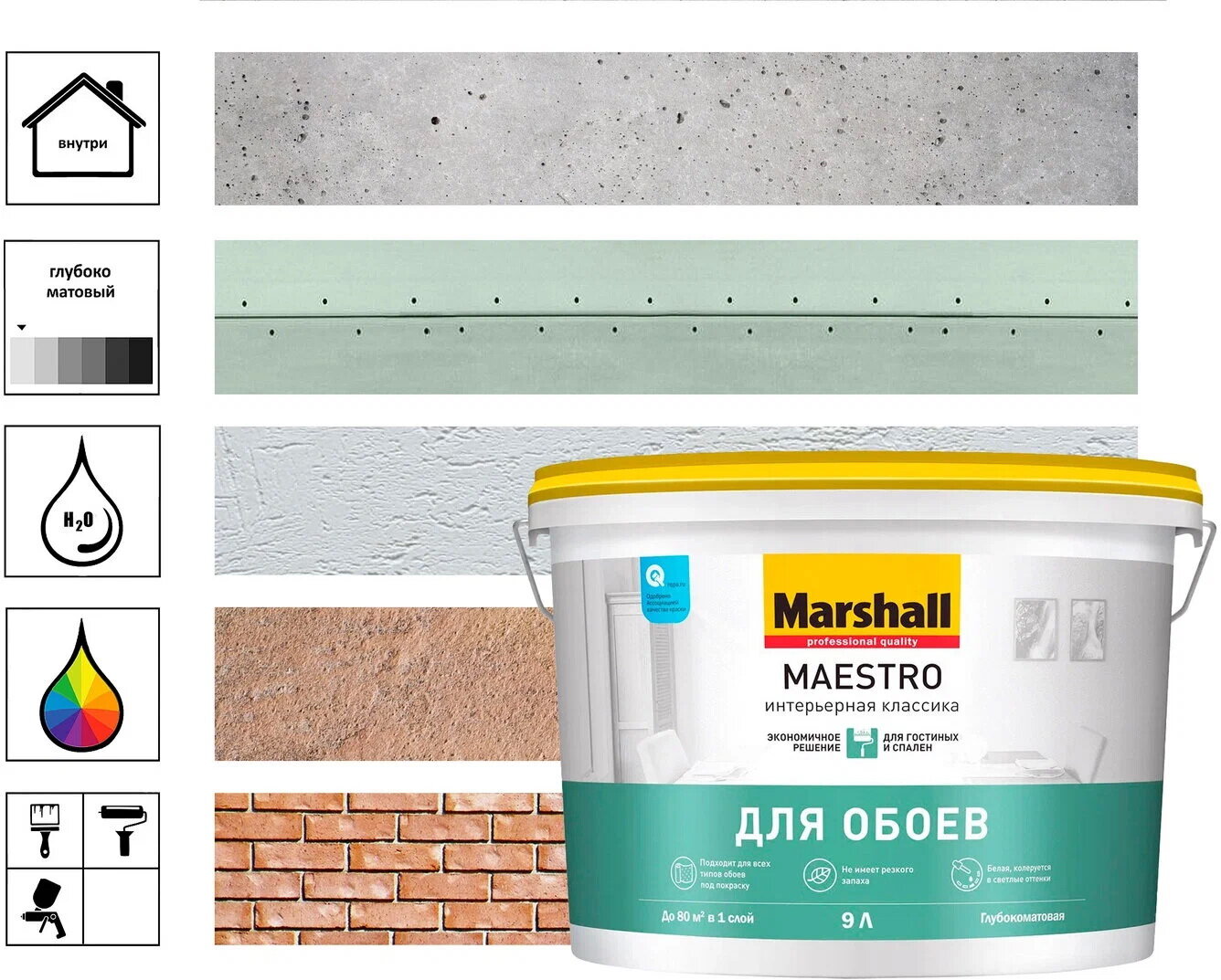 Купить Краска для обоев и стен Marshall Paints Marshall Maestro Интерьерная Классика, для обоев,глубокоматовая белая 9 л.